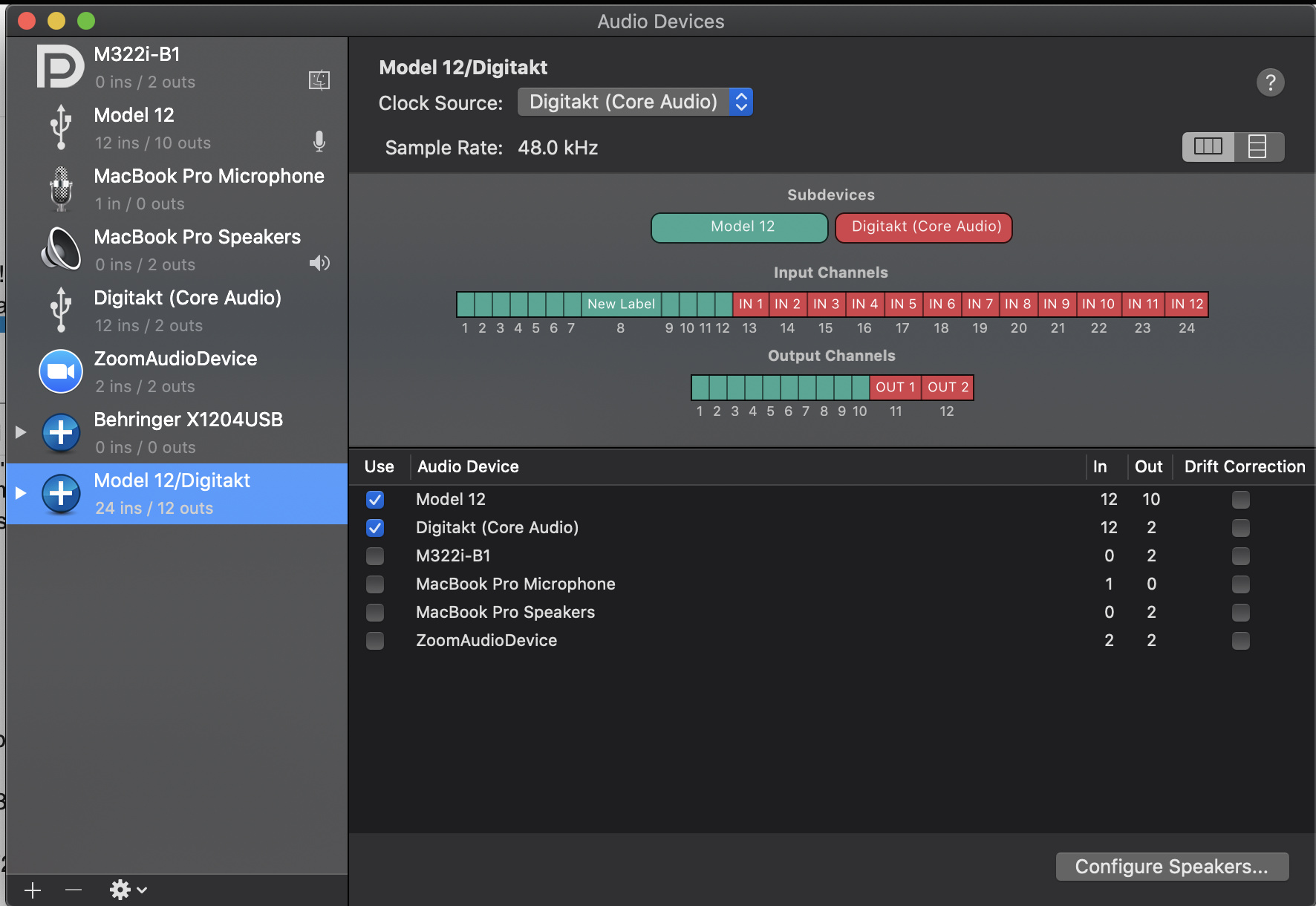 I’ve just started setting this up with my setup alone last night. I created an aggregate device in my Mac midi settings, combining the Digitakt and the Model 12 interface. When he has his Digitaky here, I’m going to try to add it to the aggregate device so its made up of two DTs and my mixer interface.
