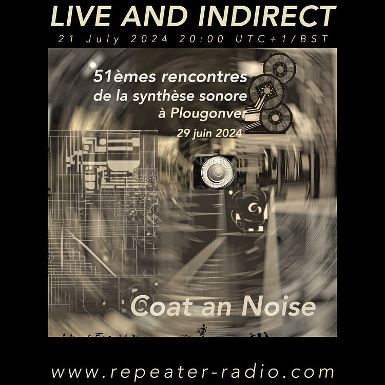 The Live and Indirect session on Sunday 21 July 2024 at 20:00 UTC+1 / BST on Repeater Radio features a recording of # 51e Rencontres de la Synthèse Sonore à Plougonver - Session #1: Coat an Noise.