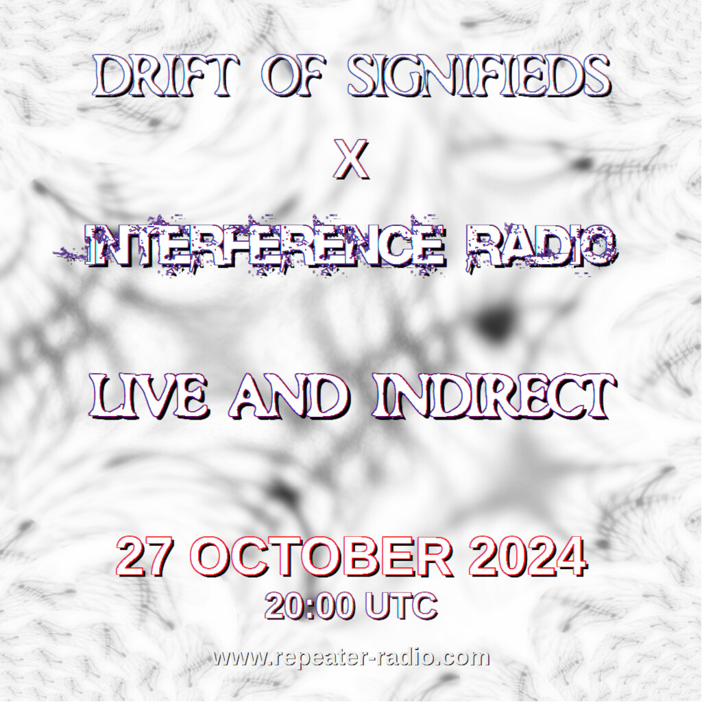 Tomorrow night finds Drift of Signifieds in a mashup soundclash with Interference Radio, Live and Indirect on Repeater Radio at 20:00 UTC on Sunday 27 October 2024.