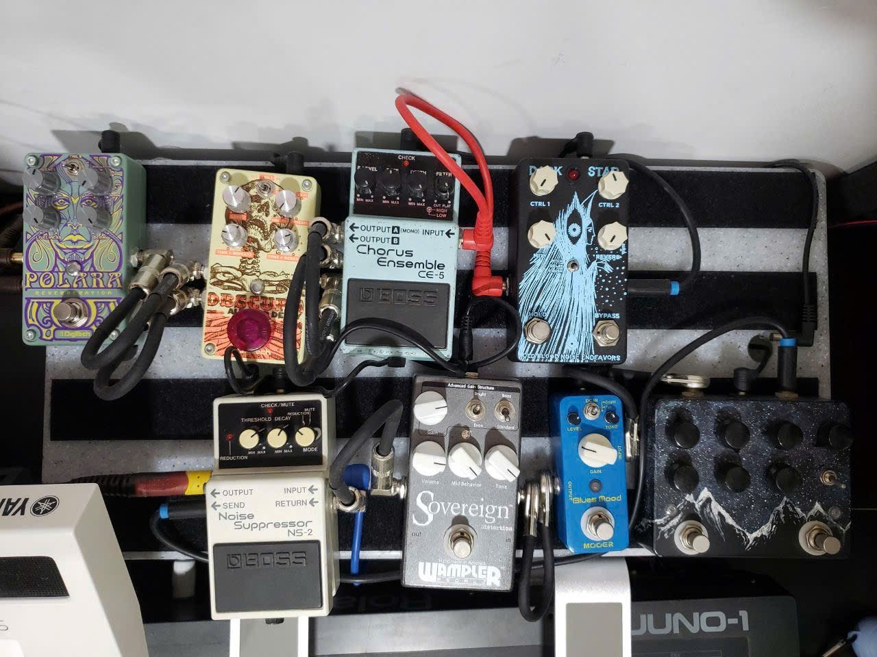 I went for the shorter audio cables between the pedals but stuck with individual power adapters. I slimmed down my setup considerably and removed all of the cables that aren’t needed (before it was like „maybe not have everything on the desk but leave the cables plugged so whenever you use it you’re ready to go“). That means the power adapters and cables aren’t bothering me too much as it is right now.