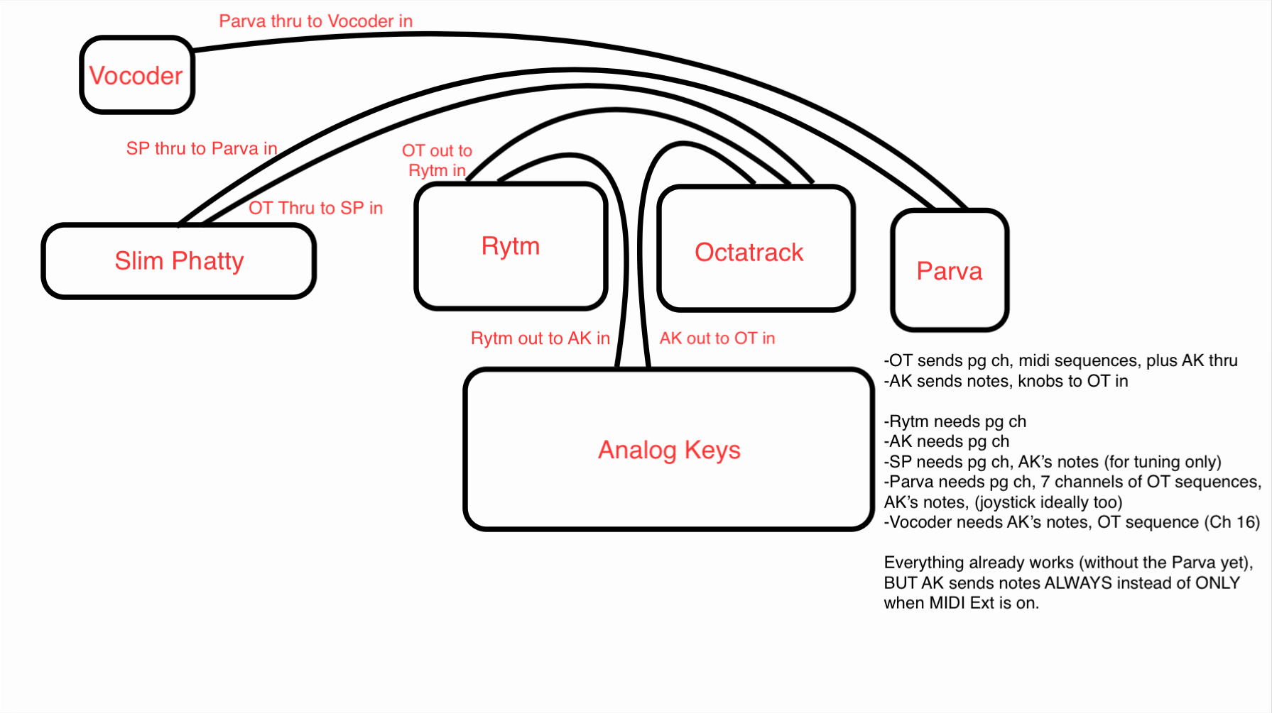I think what I’m looking to do is pretty normal. In addition to a Trinity setup, control a couple of synth modules (Parva, Vocoder) using the Analog Keys as a midi keyboard and also sequence those modules from the Octatrack. Sequencing should be done with trig presses on the Octatrack and key presses on the Analog Keys. (Minus the Parva that’s still in the mail, I have this part all working fine already)