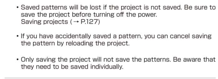 • Saved patterns will be lost if the project is not saved. Be sure to save the project before turning off the power. Saving projects ( → P.127)