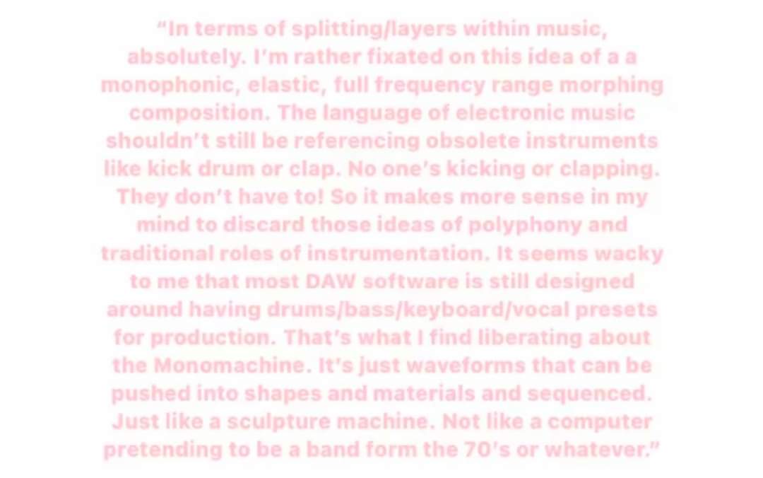 it shouldn’t make a difference what gender Sophie identifies or doesn’t identify as in regards to this thread. It’s disappointing that part of the focus has shifted there instead of staying on the amazing sound design Sophie does on the Monomachine. Sophie uses the Monomachine pretty much exclusively for sound design and probably a lot more. Part of the unique sounds that come out the the Monomachine happen when utilizing the sequencer with p-locks and what not. It would be safe to assume that …