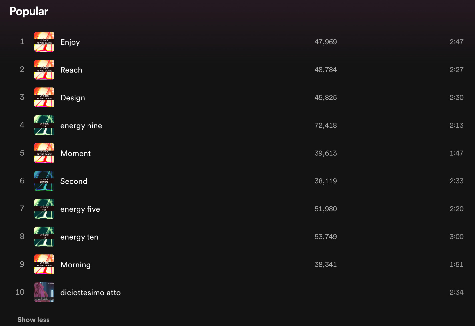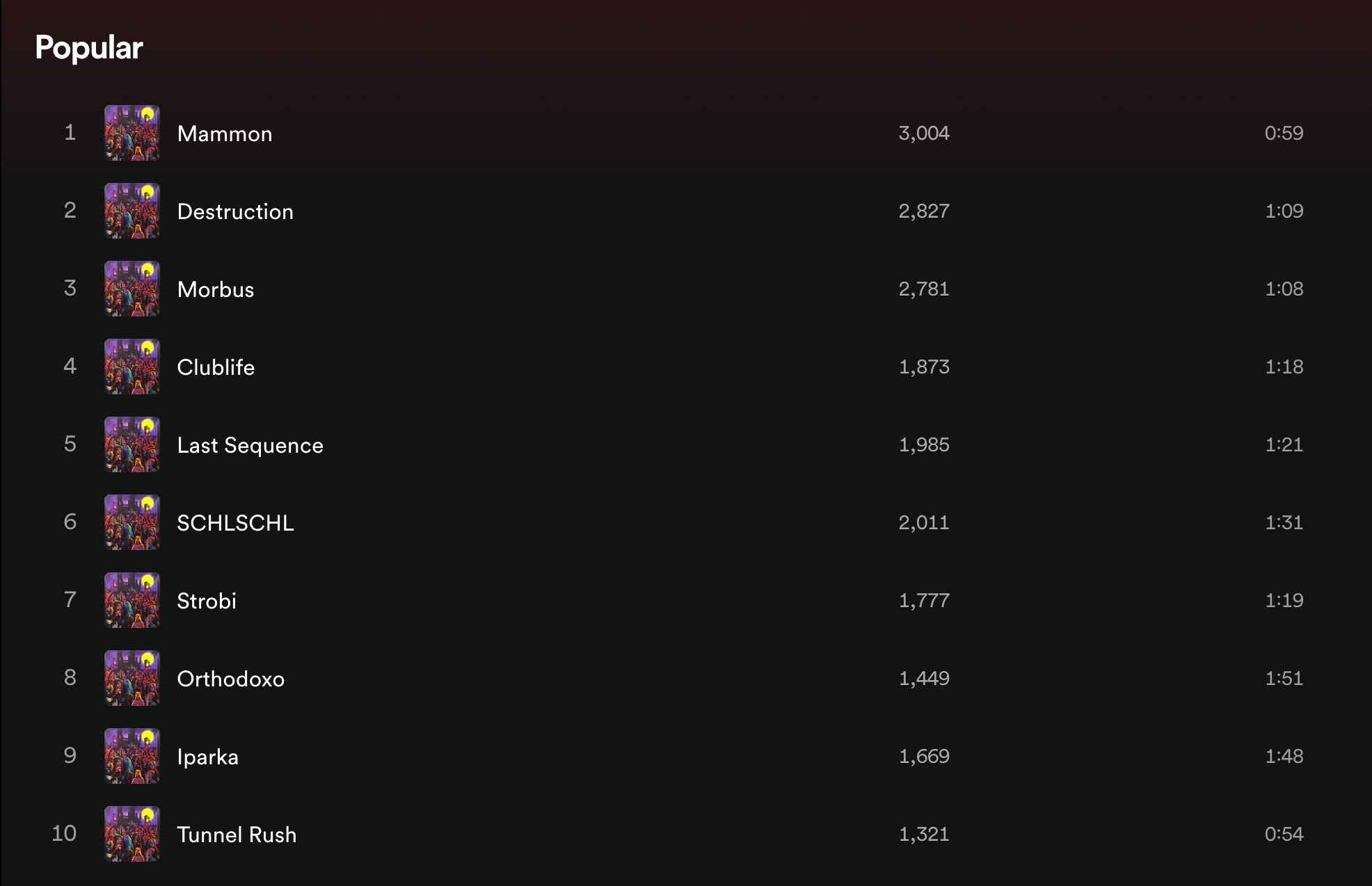and it looks like this (all of these are commercial type AI generated techno-ish stuff similar to what’s playing on Tomorrowland, but reeealy short, some of these are like single note playing for a minute lol, also using screenshots instead of links so anyone with spotify won’t get this “virus”):