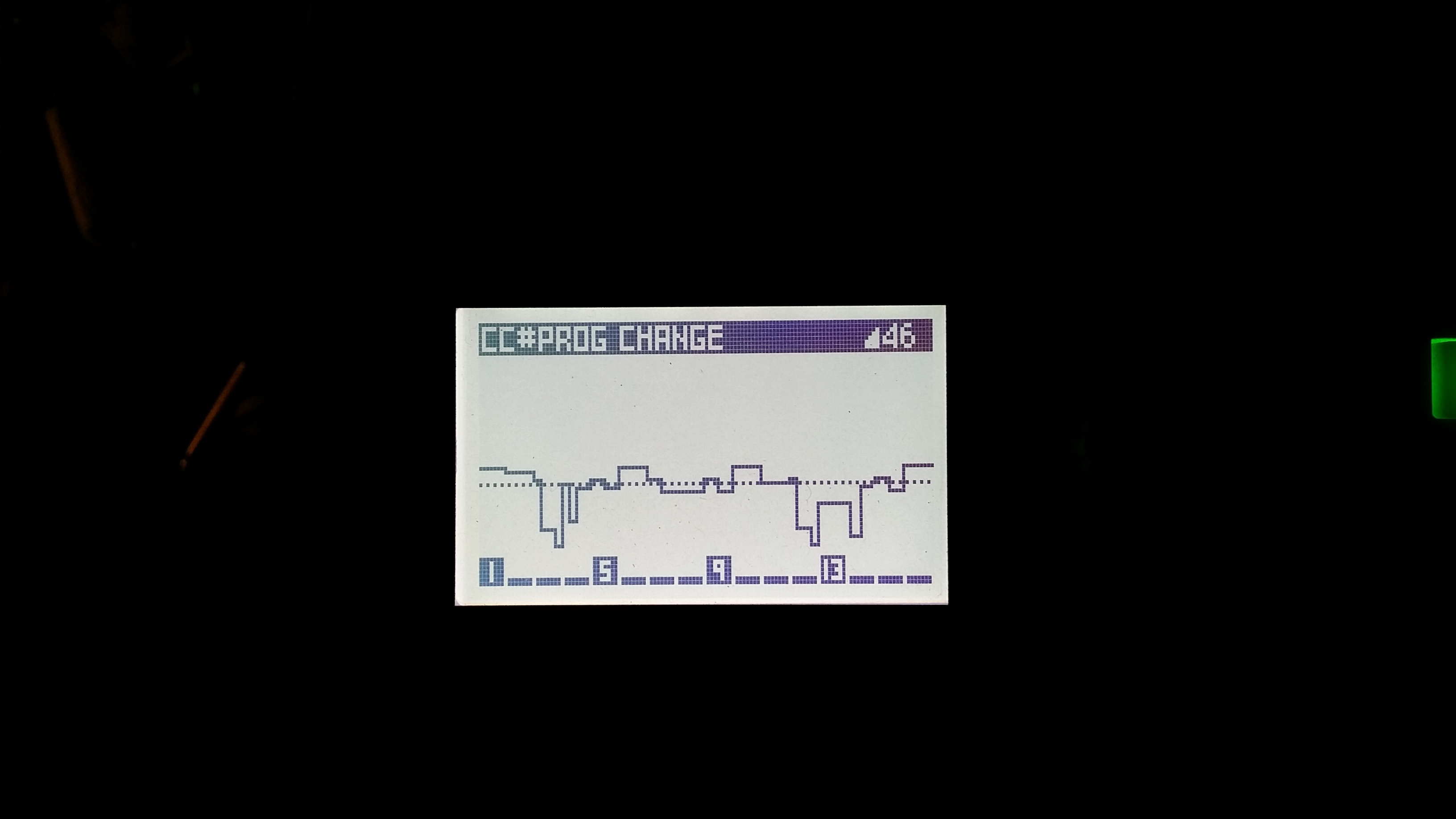 On this picture you can see the “disp” menu of prog change. When you want to alter the program, you just have to turn the encoder and select the number you want (u per left number) and select the Step on Pyramid and it’s done, the prog change is locked. With zoom you can be more precise. Change can be programmed live and will take place immediately.