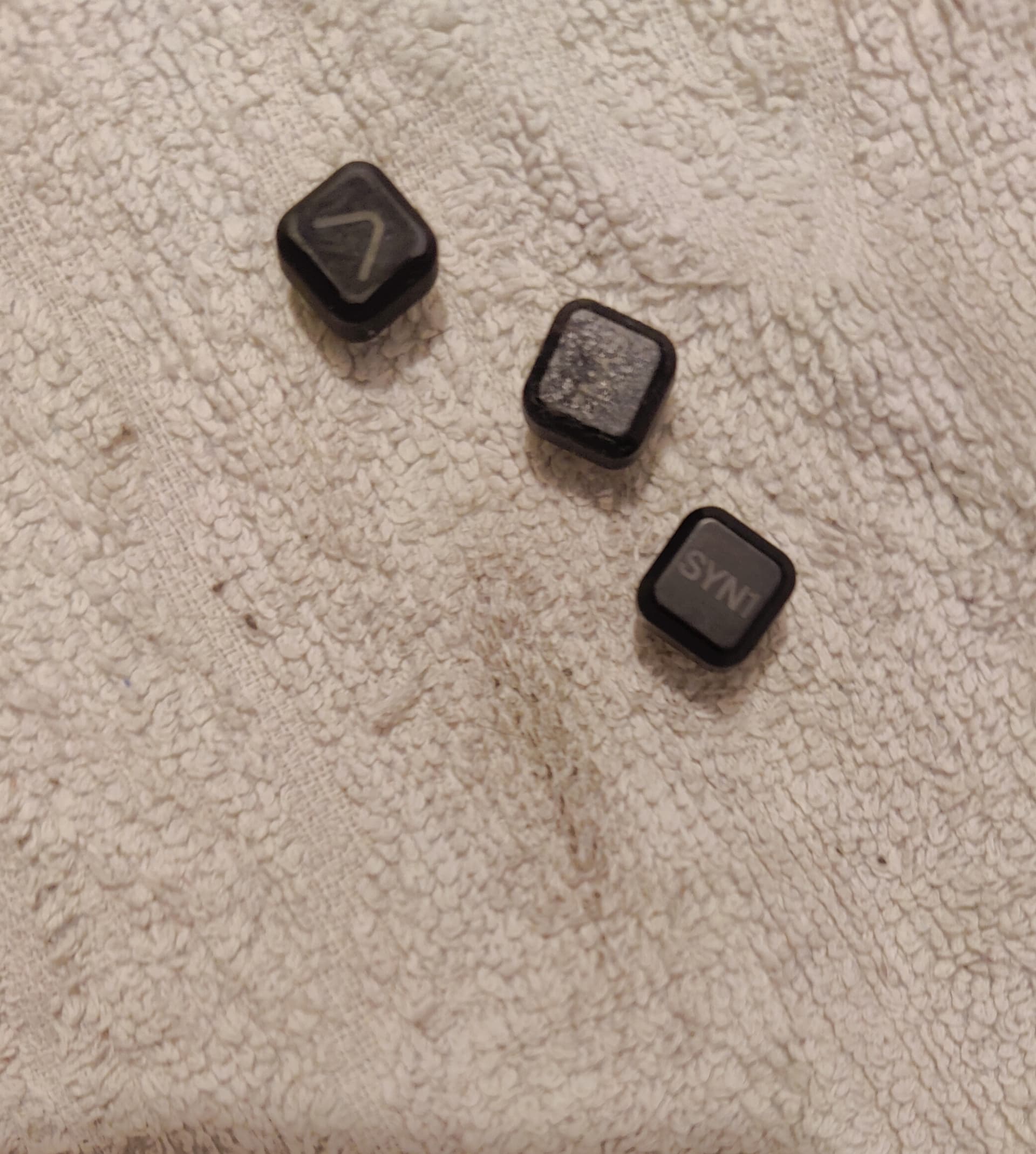 Here’s how my Digitone buttons look after rubbing the coating off with a towel. In the photo only Syn1 is cleaned completely, but you can probably imagine how a full set looks like.