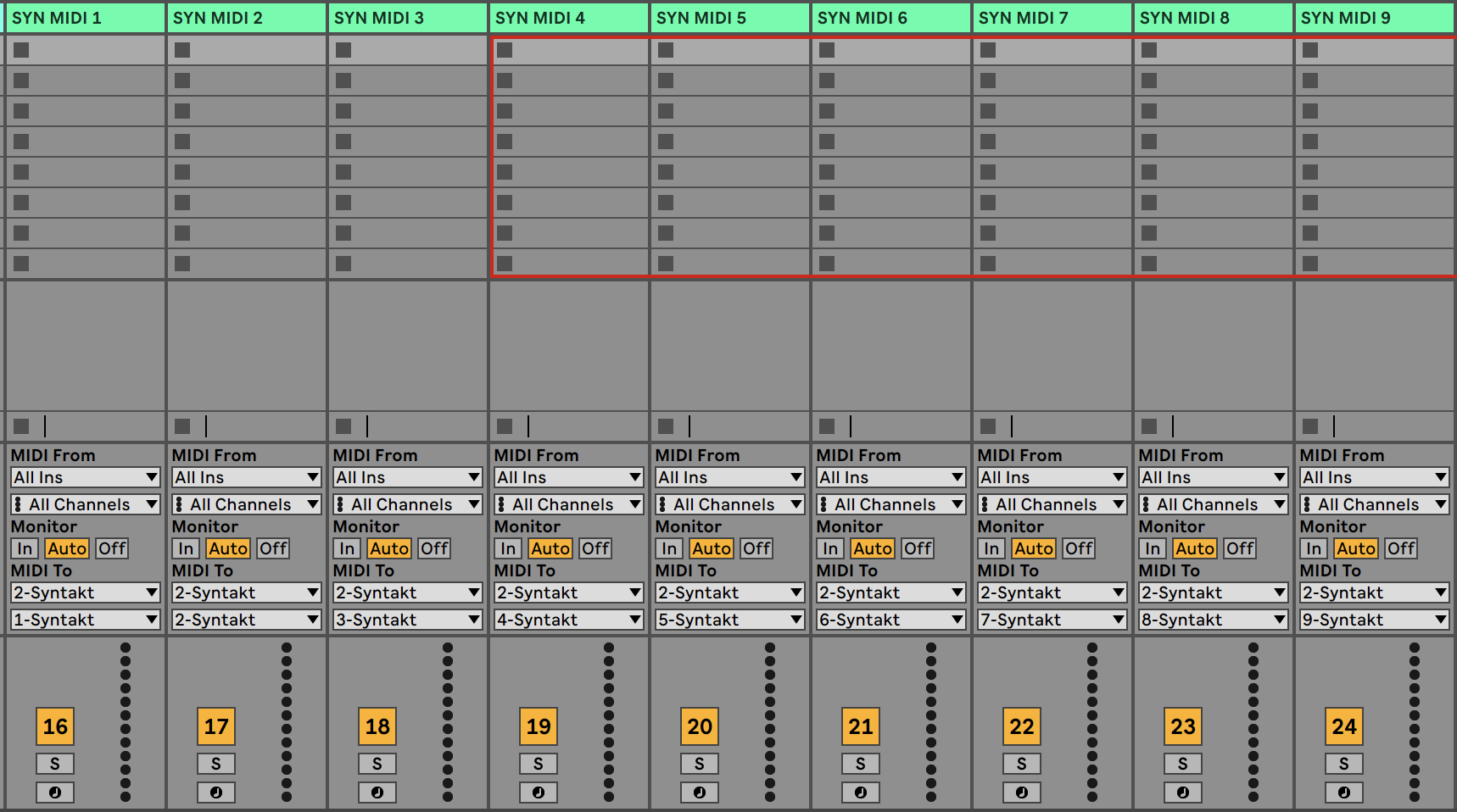 I can play chords etc on Push on each of the Ableton Syntakt Midi tracks, I hear these. What isn’t working is recording that midi information to each Syntakt track (regardless of wether record or record/play is active on the Syntakt)
