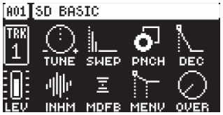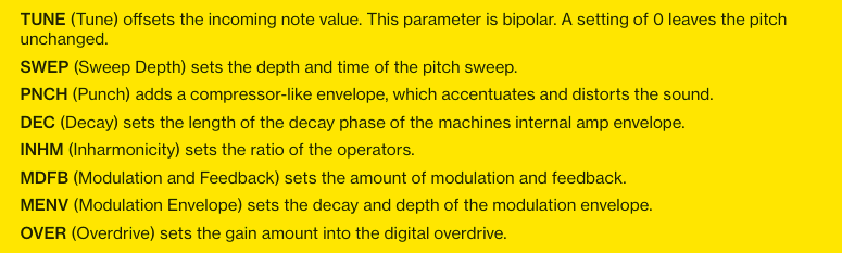 So turns out you can do quite a bit with it. It does a nice flute-ish sound, cool atonal bell-ish stuff, your basic percussion stuff. For melodic stuff you can sort of change the waveform a bit by pulling up the MENV a lot and keep the feedback completely down. 7x SD Basic
