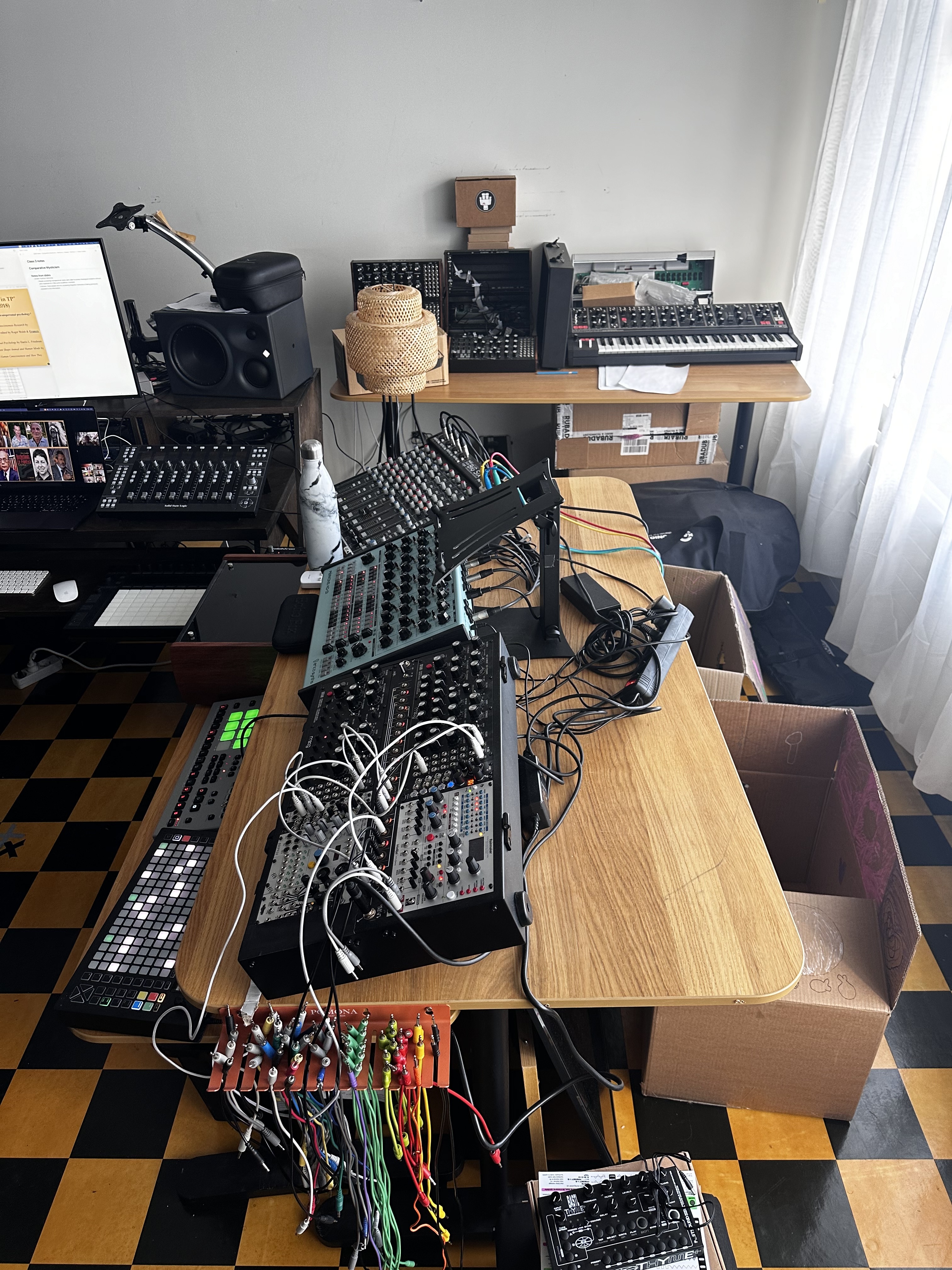 Here are some pictures of my table, and I would love to have a 3 tier stand for synths behind my current gear.
