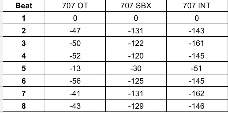 I tested it synced to OT, SBX1, and internal clock, the numbers in the chart represent the number of samples away from where each 1/4 note should fall, 50 samples is just over a millisecond (@ 44.1khz)