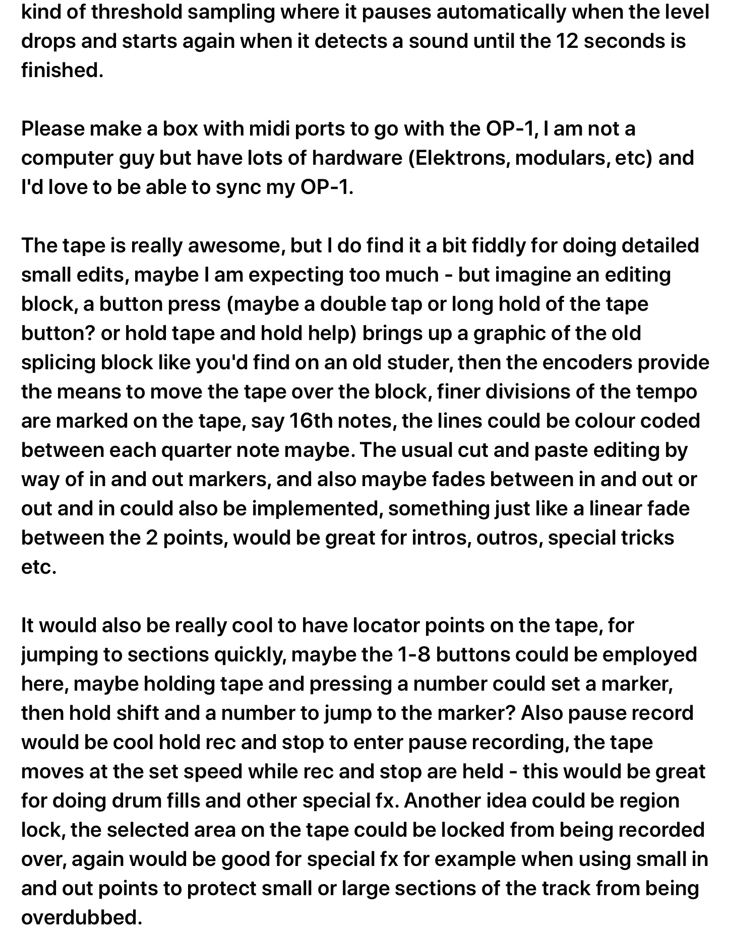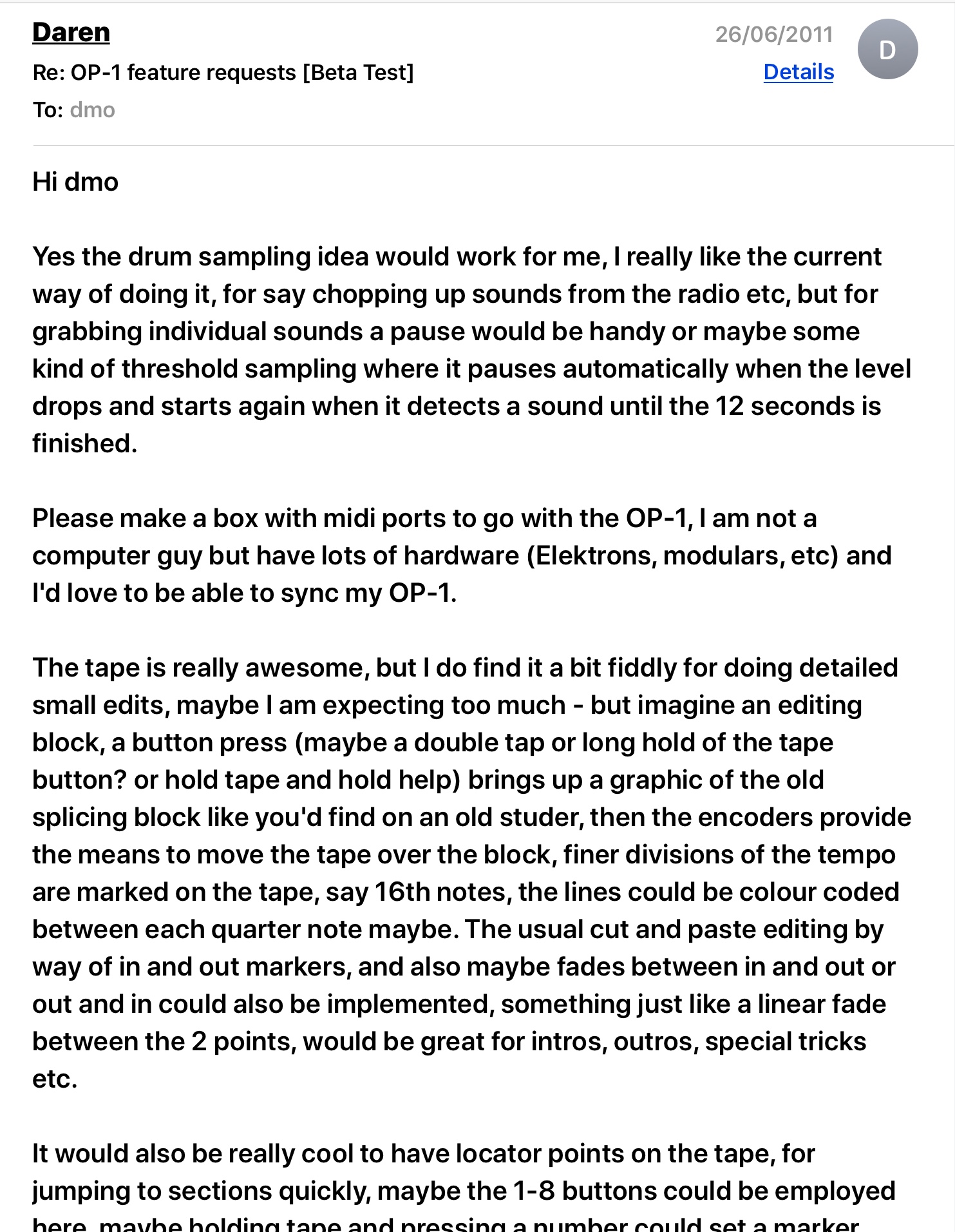 Edit: Just read some of my old TE email beta feature requests, I asked for this in 2011, along with a bunch of other stuff, and a hardware interface to connect the OP-1 to other gear - obviously before the Oplab came out, I totally forgot