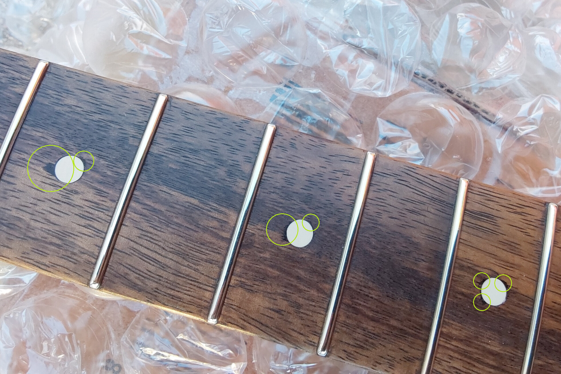Then, after all dots were removed, I first used the US equivalent of a 6mm drill bit to clean up the holes in the fretboard, afterwards moving on to the 1/4" bit to open the holes fully, and while .35mm doesn’t seem like much, it doesn’t seem like much, but in reality, it might as well be a meter’s difference. If your placement is off, the centering will be ruined, it will look janky, thus I made the decision I would not start the drill in the air above the hole like one would when trying to avoid chip out, I would take on the task of centering the drill on the hole, keeping it perpendicular, and starting it in contact with the wood fully knowing there would be repercussions. This is a risky maneuver and without a drill press, you have to take the lesser of 2 evils here, I made my choice.