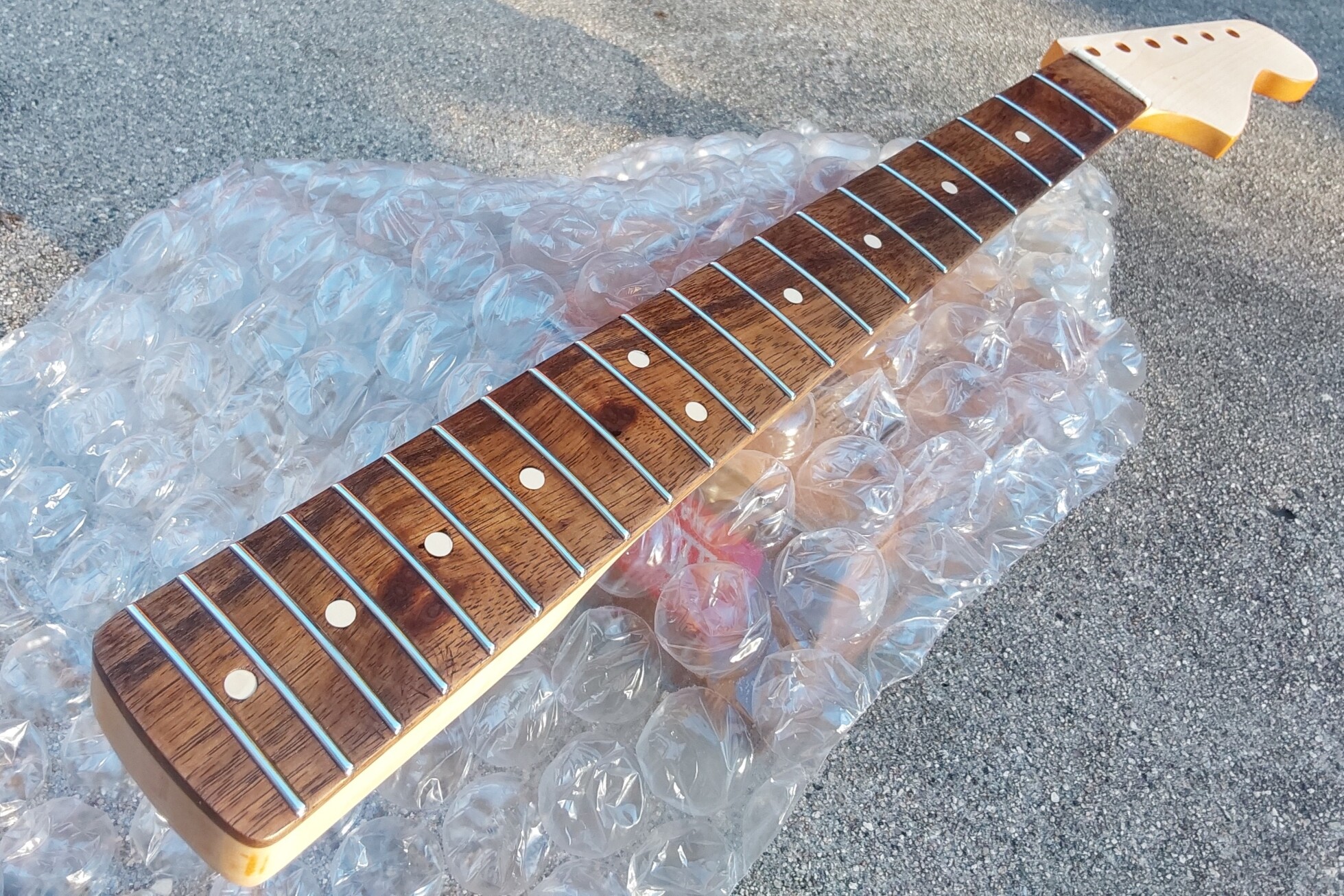 However, when I picked up this classic vibe jazzmaster neck very cheaply, I decided that I would use it for a few experiments aside from dressing the frets, including fretboard staining and changing the 6mm pearloid dots for US spec 1/4 inch clay dots.