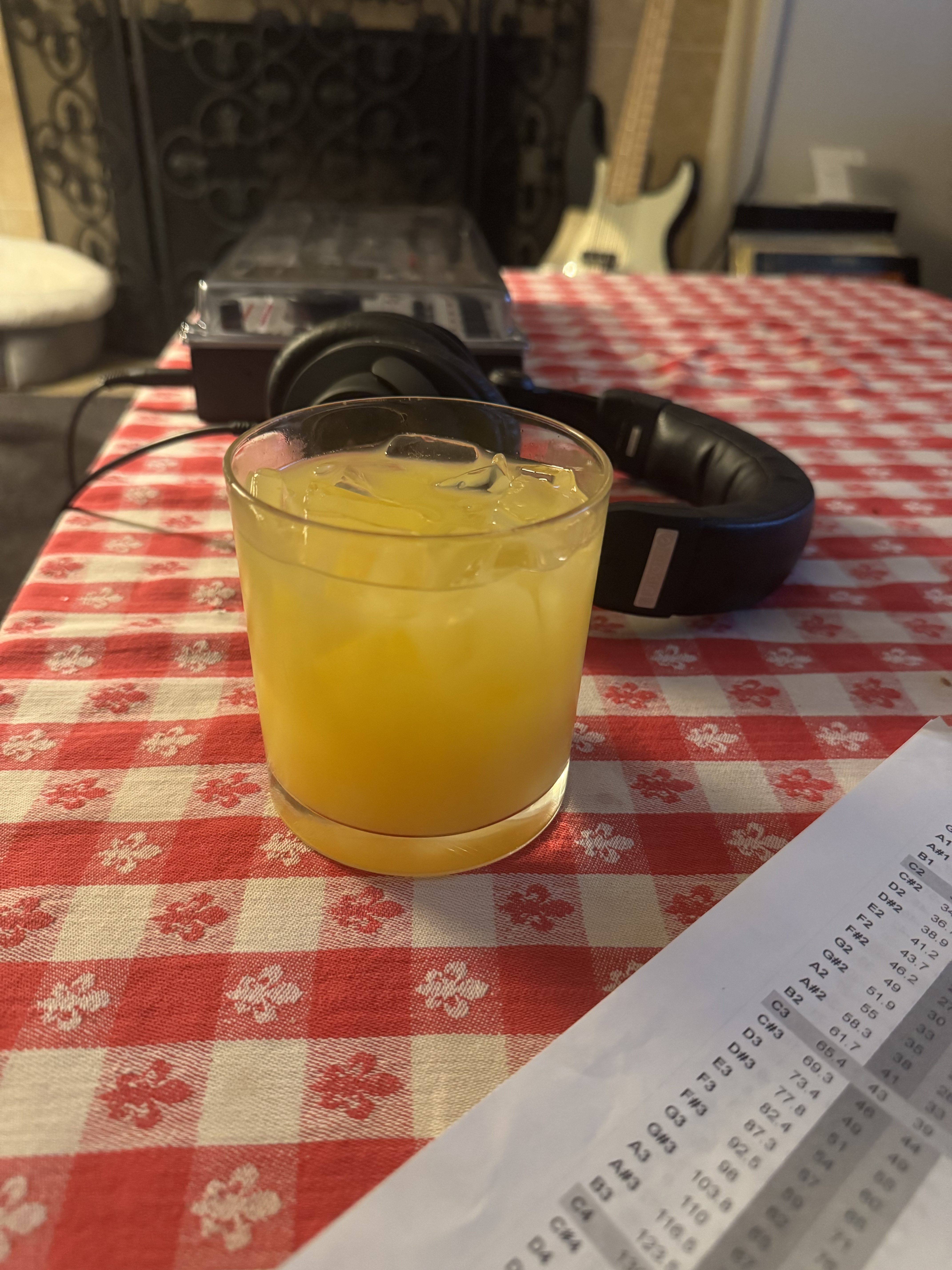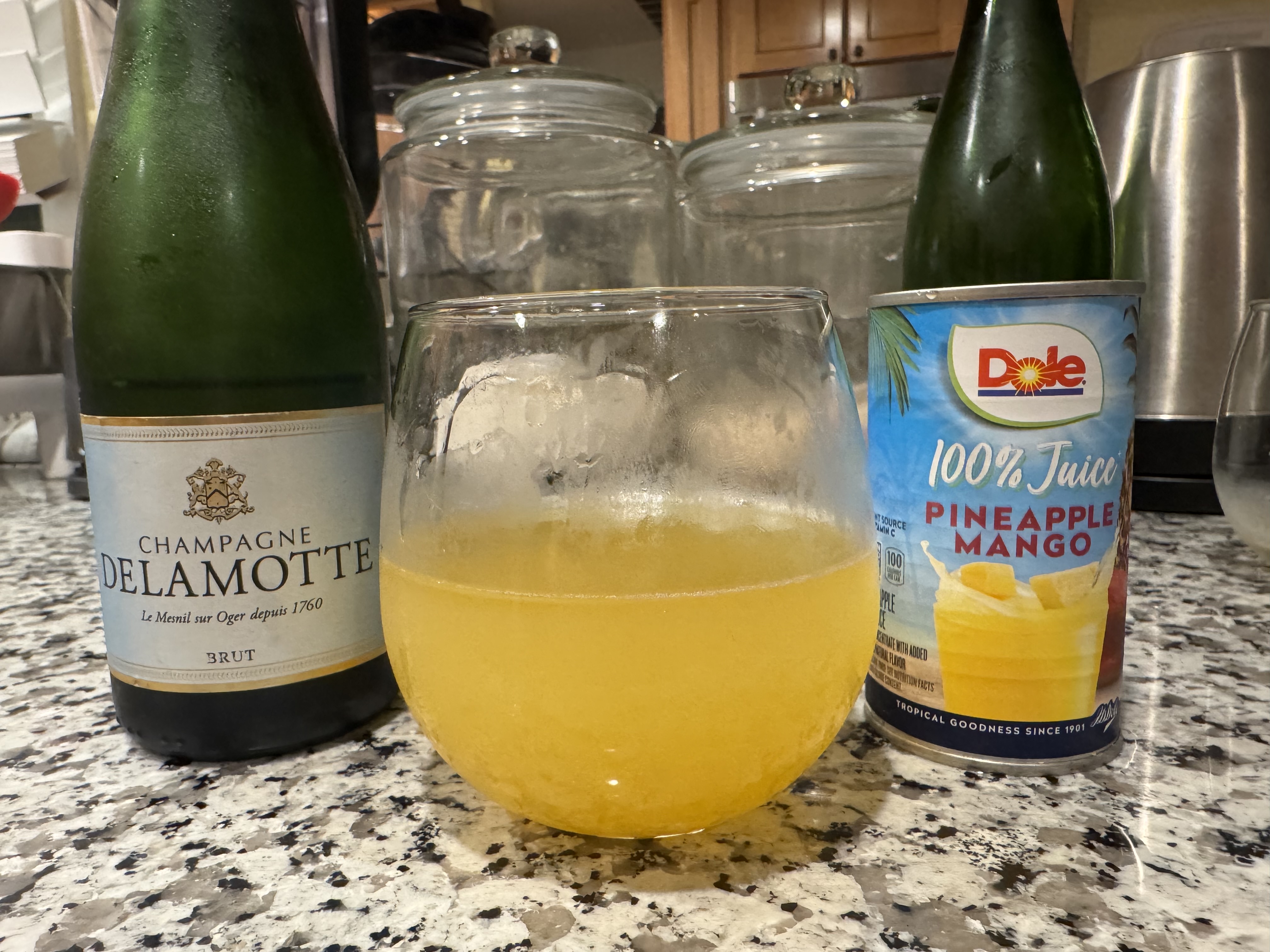 My riff on the mimosa. Instead of orange juice, I use pineapple mango juice. I call it the Jason Mimosa