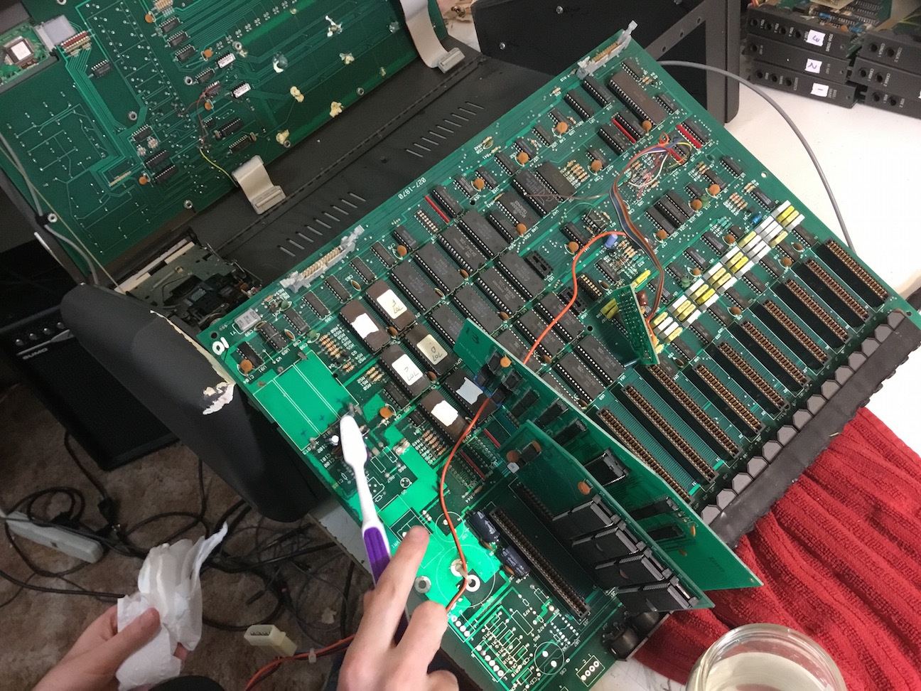 Here is a photo of my son Nigel cleaning off the battery leakage, followed by one showing insides with the motherboard and daughter cards still in place. It’s a cool peak into the past!