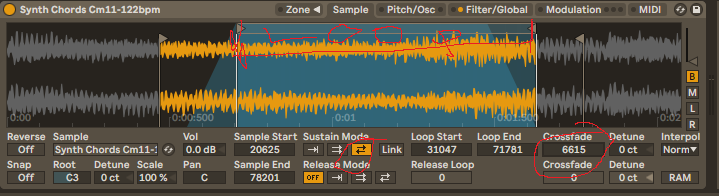 Also keep in mind that if you wanted a different part of the loop but the same concept, that the way to achieve it is the same. Crossfading is more useful when it’s not a rhythmic sample because it helps blend the edges but something like this, you just want a loop which comes from the middle I guess you’d say, rather than the beginning.