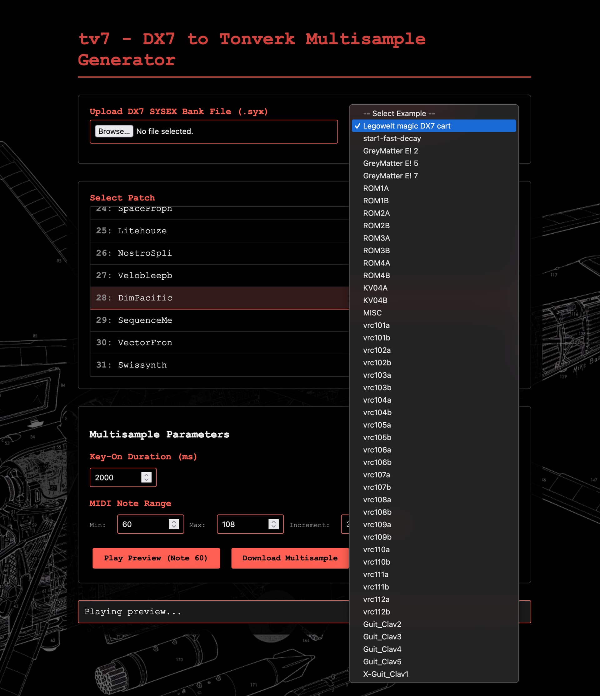 Iāve added a new feature to the tv7 web generator where it now contains many of the classic DX7 sound banks and some more recent awesome ones (like the Legowelt DX7 bank) for you to audition and generate Tonverk multisamples from on the fly.