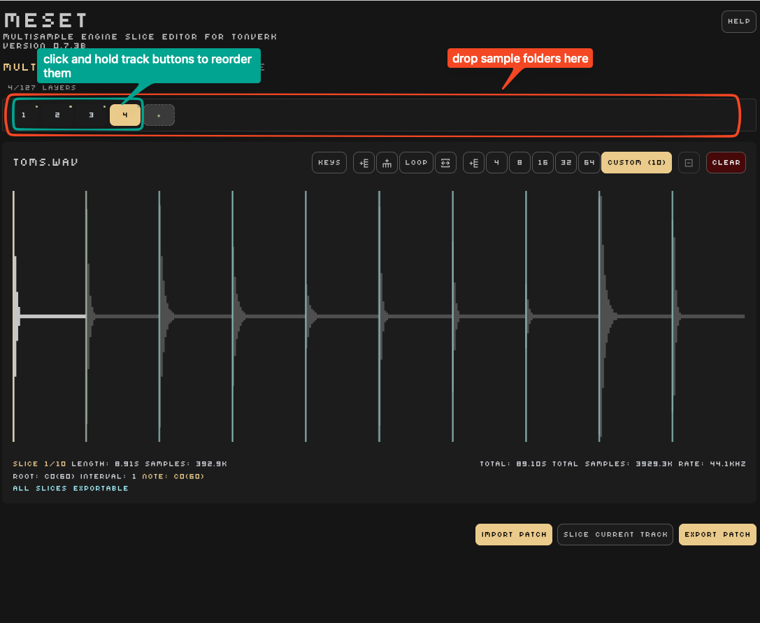 I just tried out MESET on a Samples from Mars kit (SEM Strings from 2021), and it worked like a charm. The big thing is to specify the root note and the interval. There was a bit of head scratching to decipher the symbols, but I got it working, exported, and transferred to TV. There was some more head scratching to figure out how to load a user multisample preset, but I just played it from the TV. Pretty sweet. I can’t wait to make some more multi patches and drum kits with my SFM sounds.