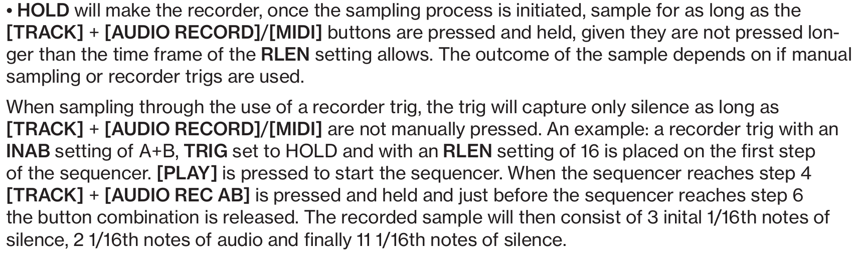 When I tried the Hold method over empty recording slot the result was the recording didn’t last 16 steps - it was cut when Rec1 button was released (silence + recording only).
