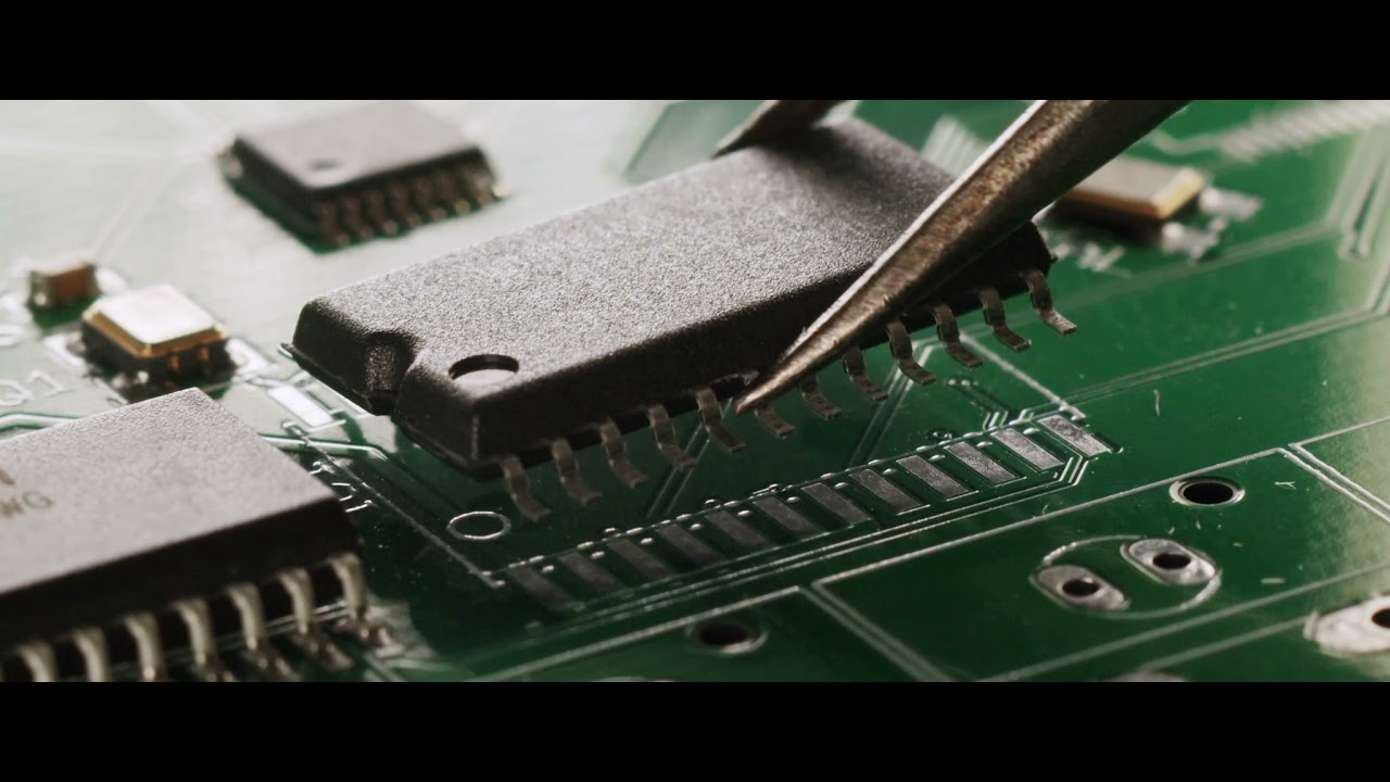 Chips , circuit board , black case that is screwed together , sockets for leads , sliders.