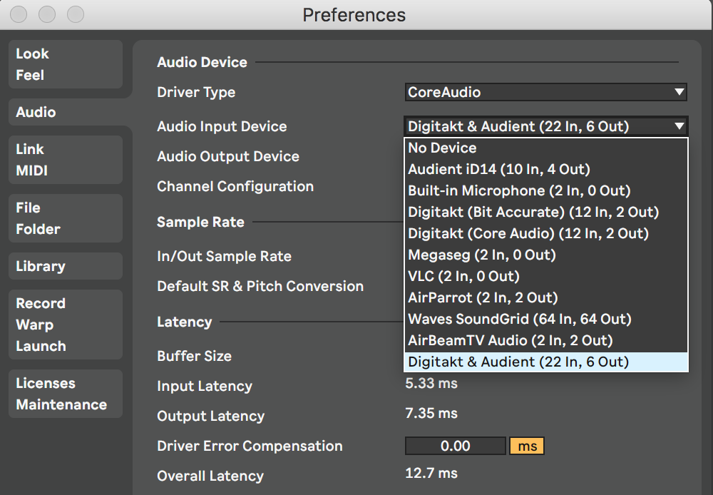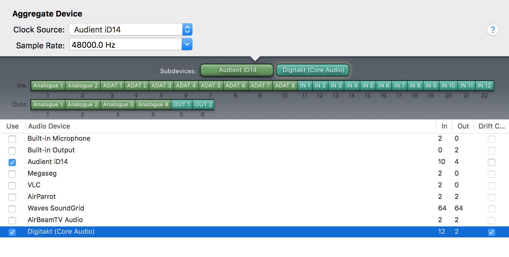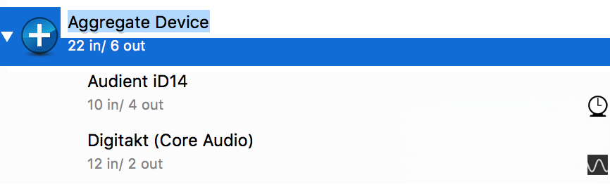 In the left panel there will be a new device with the 2 interfaces merged. It is possible to rename it, I called the new merged device “Digitakt & Audient”
