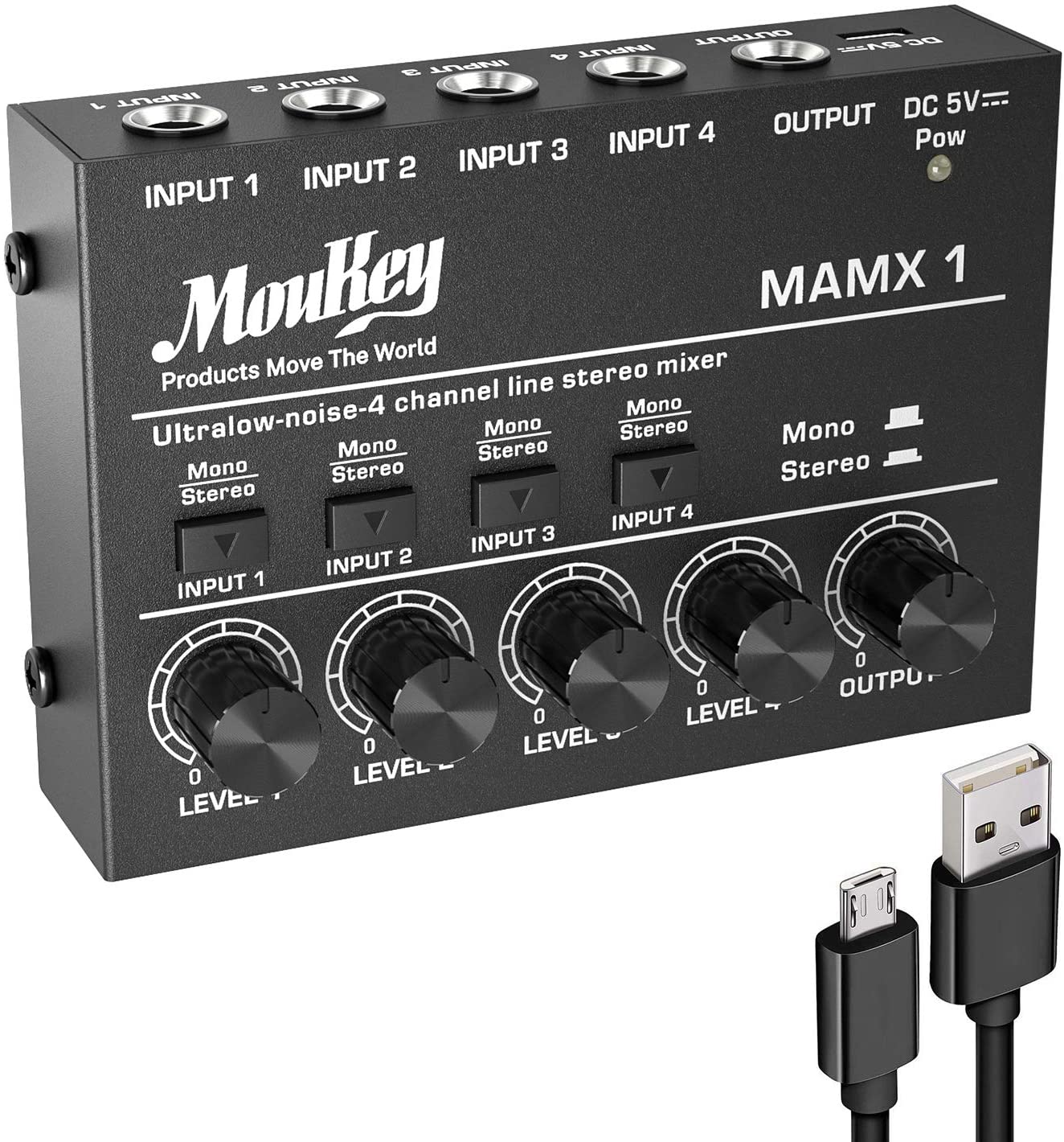 4 mono/stereo inputs (1/4" jacks): Moukey MAMX1 $24.88, uses a micro-USB cable for power. Amazon US Link.