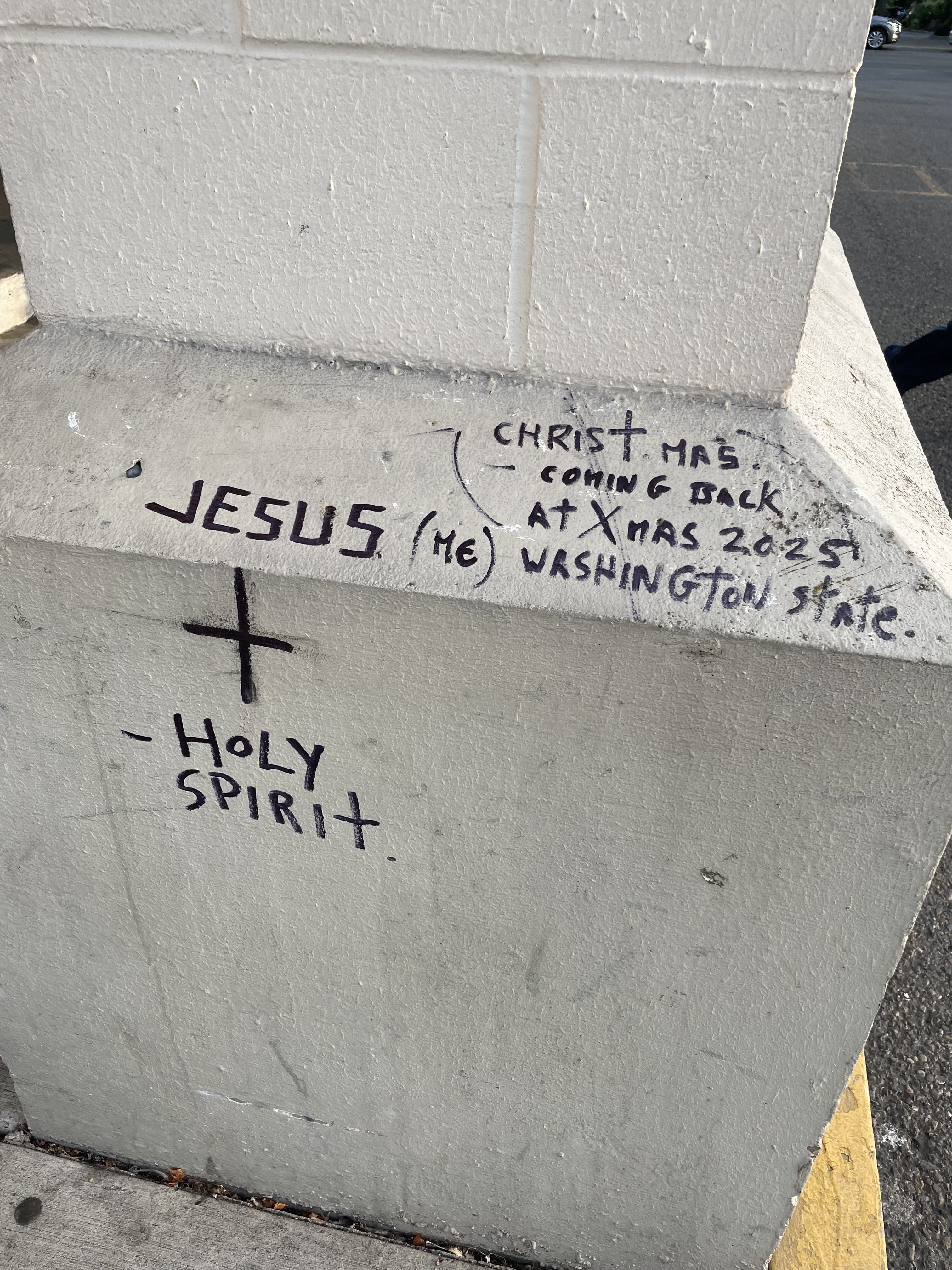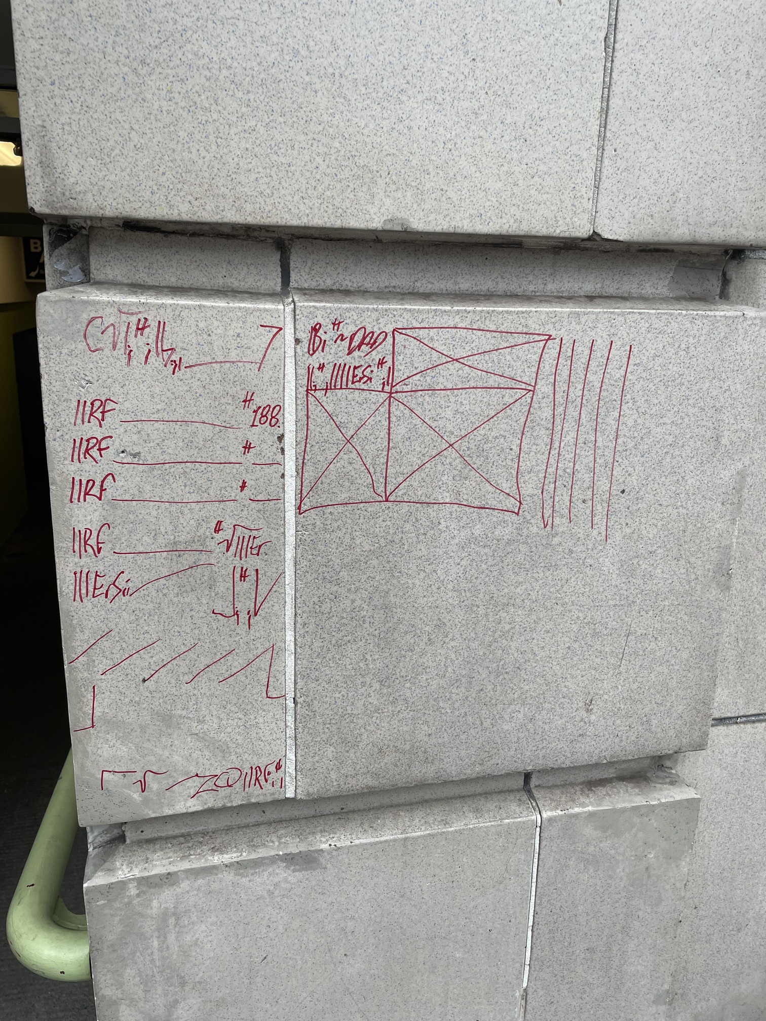 There is one on a trash can and bench and the sidewalk adjacent to it, in a park next to a liquor store ( plus a pot shop ) near where i live. Also hard to make out, but it is obviously a note to oneself as a reminder to get your life back together and to stop throwing yourself away. I always say hello to the men who are very often sitting there, when i bike by, and they’re all very friendly and polite.