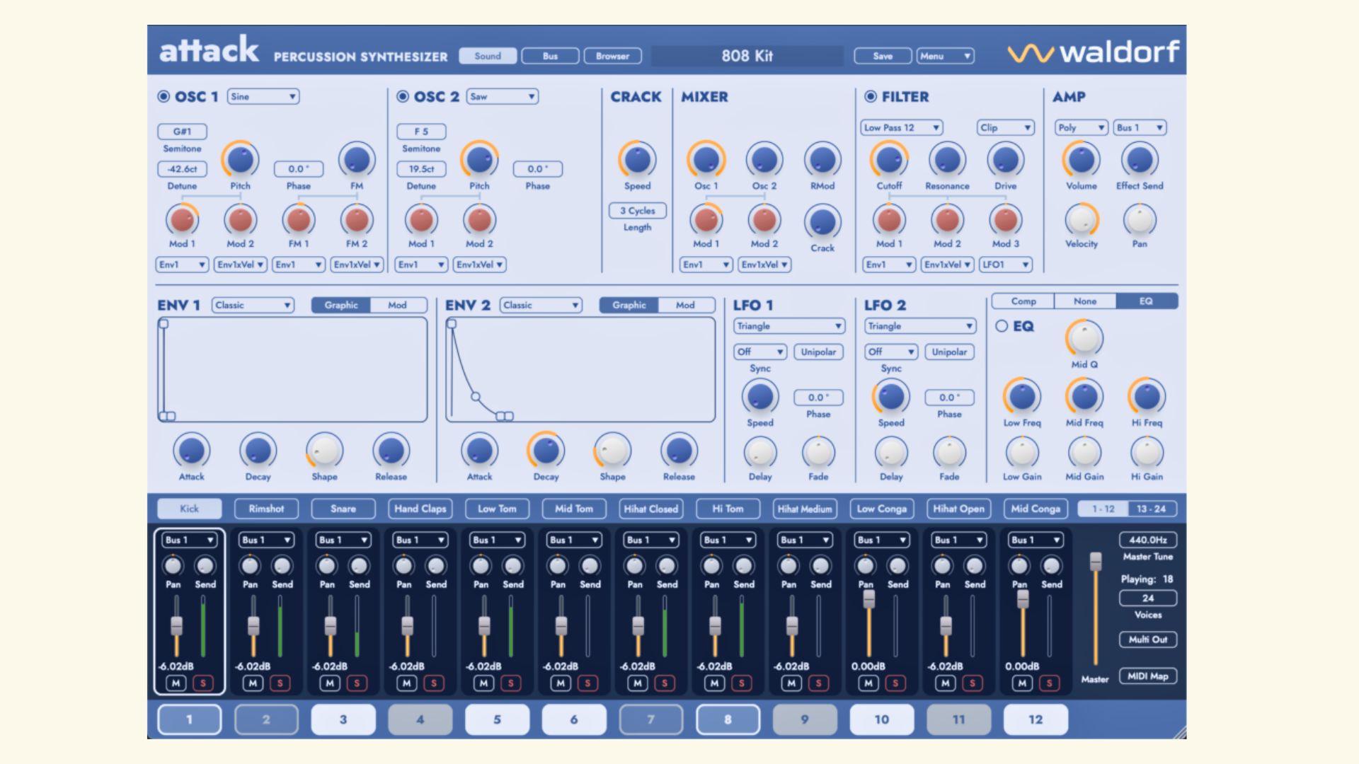 Waldorf Music Attack 3 is the third generation of the percussion synthesizer from Waldorf, available since 2001. The plugin combines virtual analog sound generation with optional samples and brings a revised synthesis engine.