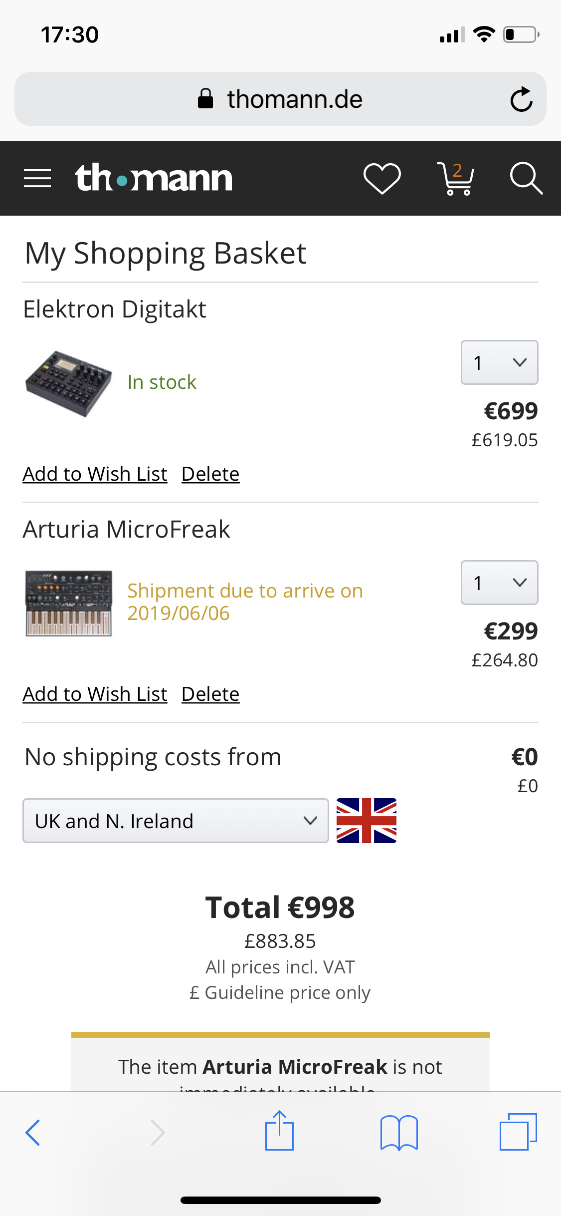 I don’t actually own any of these, and if I was doing this for real I’d probably go with an iPad and apps, or just a load of Volcas or POs, but just to mix things up a bit, and with 10 cent to spare, you get drums, two synths, a mic, mixing, recording and monitoring. Taxes, shipping and cables included. For my convenience, I went with Thomann for everything. You could probably save a bit with some shopping around.