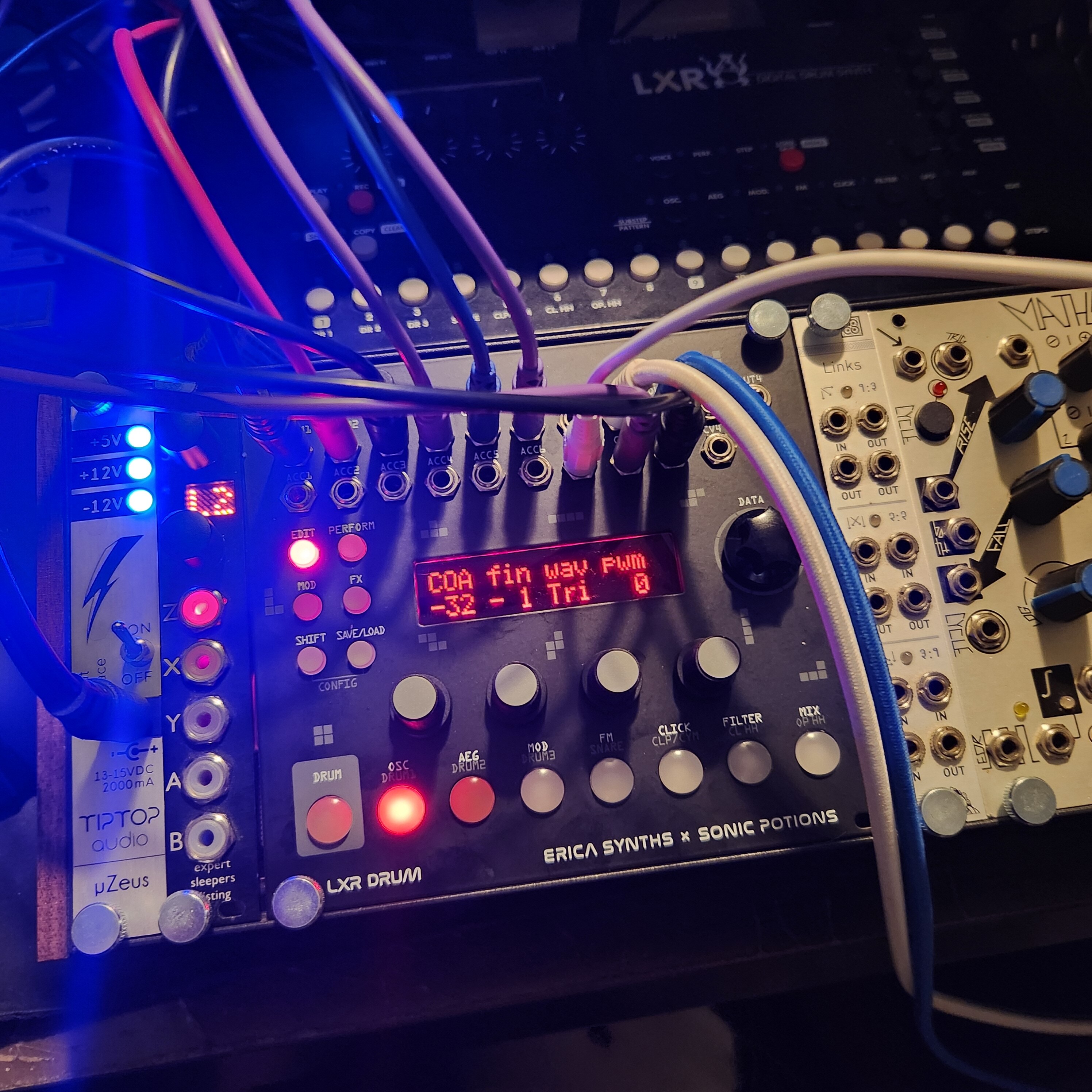 Amazingly the LXR traveled from Latvia, all the way to me in Arizona in 7 days. Just got it all wired in a couple hours ago. The layout will most likely change as I experiment with best modulation options. For now got the DT providing triggers via CV.OCD, and a SQ64 providing other modulation/triggers when needed. Originally used the SQ64 to sequence, but the lack of quick plocks inticed me to get the DT in on the action. So far, it’s pretty fun, and if you’ve used the og LXR, the UI is easy breezy as it’s more or less the same, with some slight adjustments.