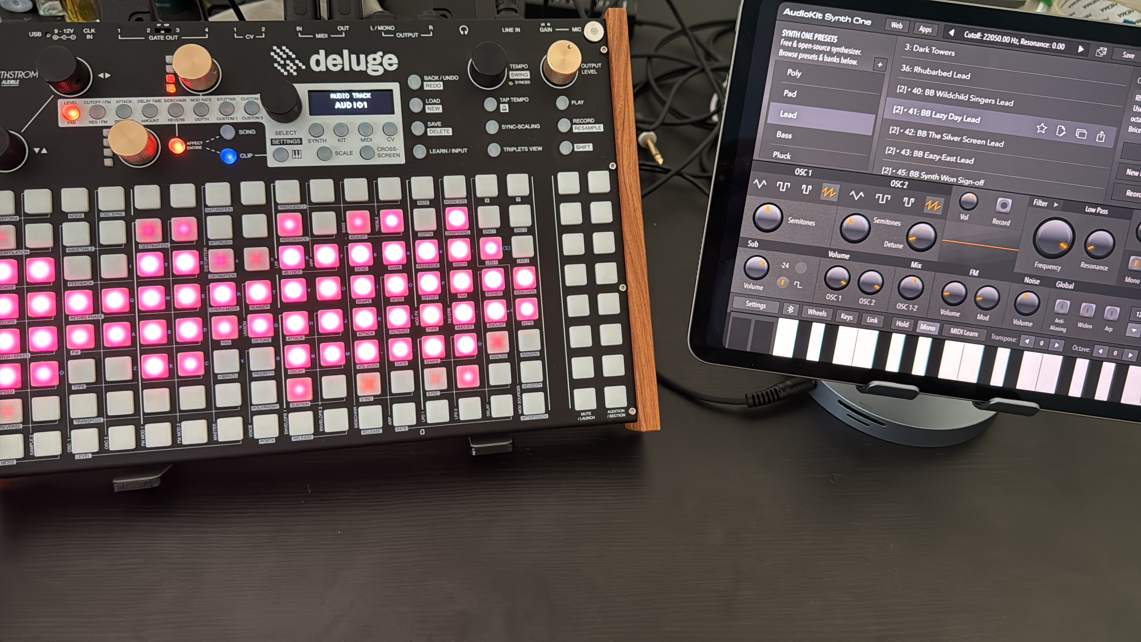I use it together with the deluge to extend the deluge with more synth power. Just create a midi clip on the deluge, have the synth app on the ipad retrieves the midi and output it over 3.5 aux to the input of the deluge for recording an audio clip.