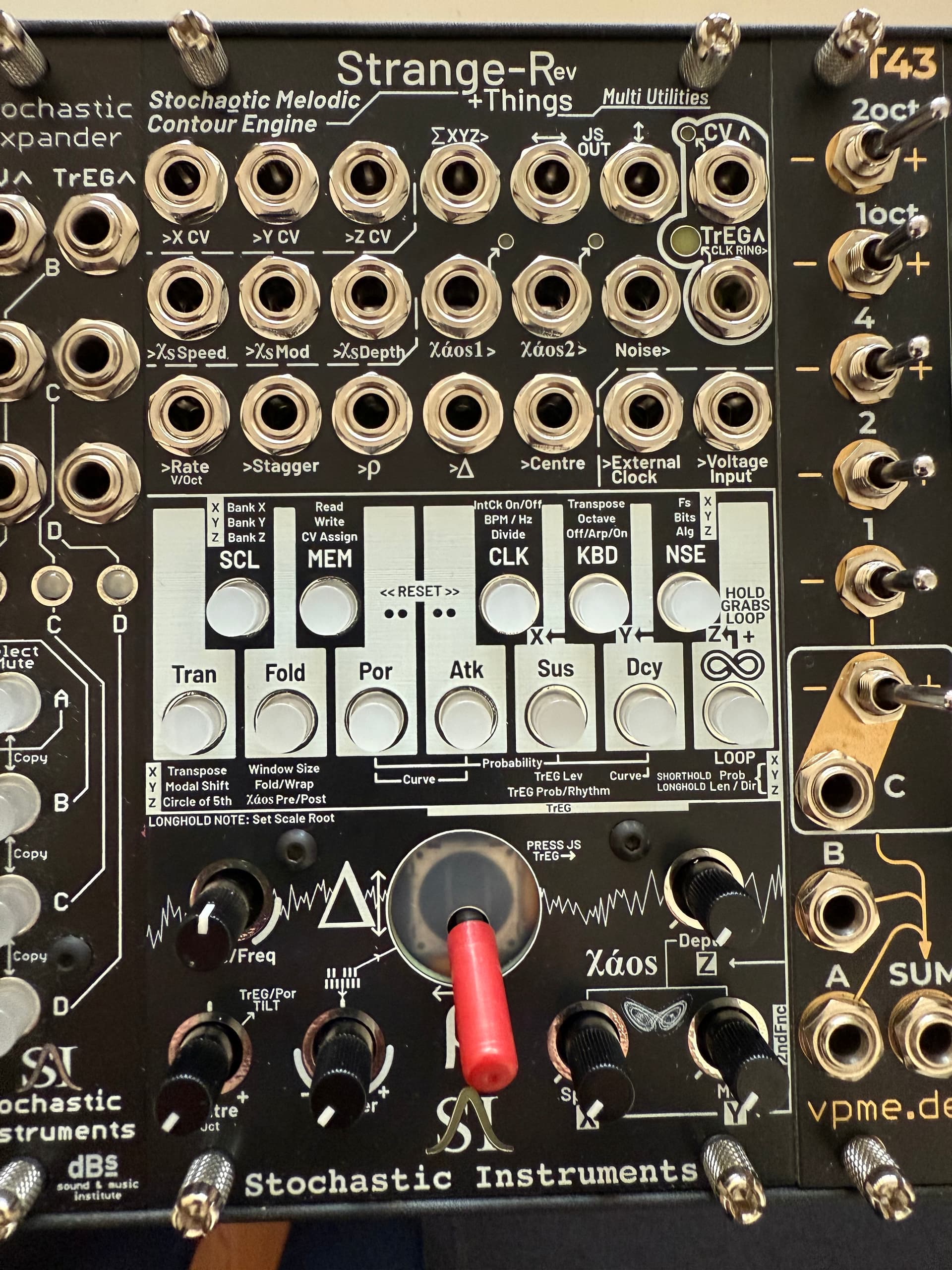 One of the reasons T43 is next to SIG is that SIG has a tendency to wander too high or too low, and it’s awkward to steer it in the right direction, and it is slow to respond. If SIG is driving something with an octave knob/switch, I can adjust there, but most of my oscillators don’t have that (Bastl Pizza is the only exception).