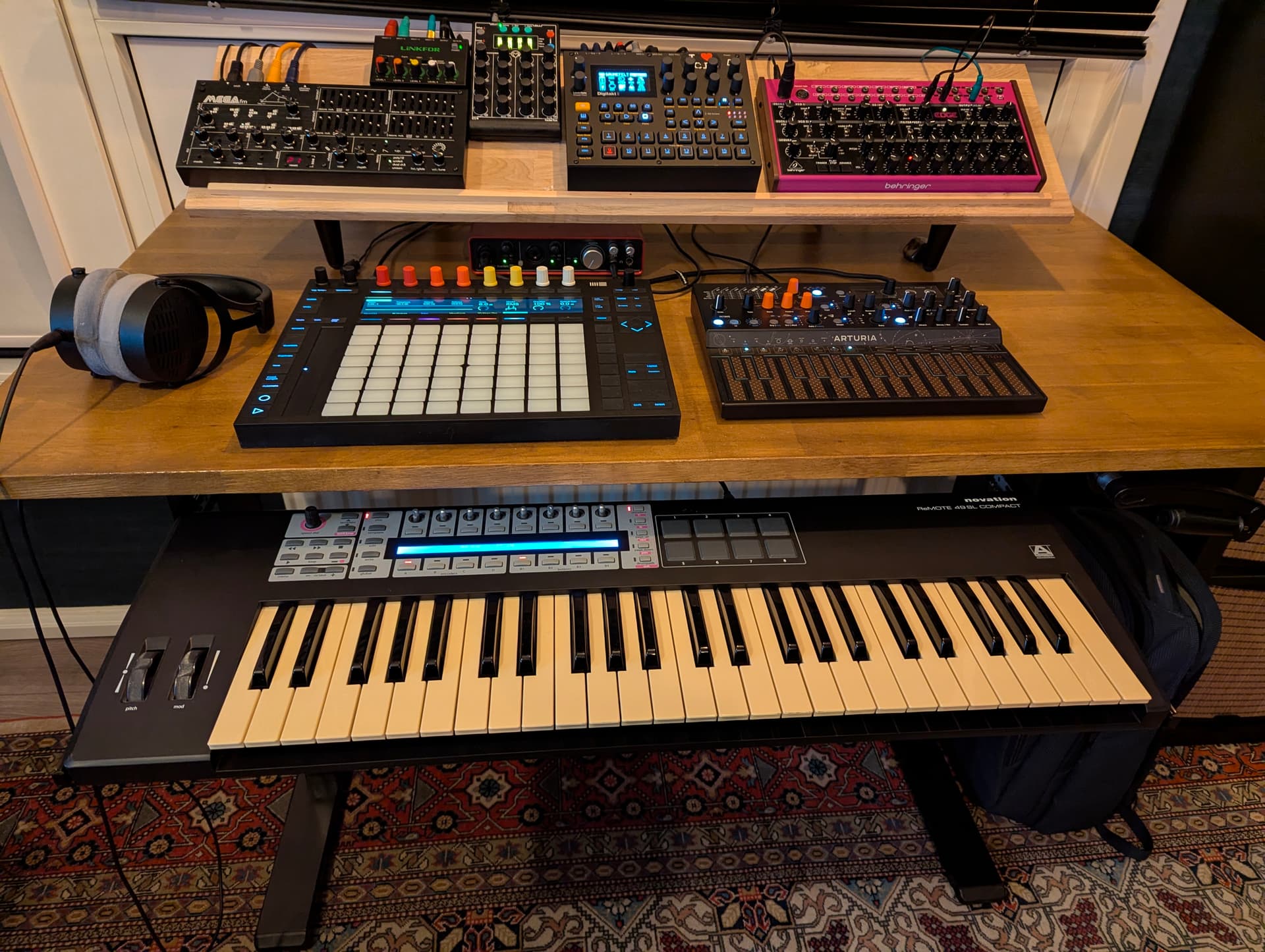 Got a very cheap novation remote 49 sl compact from ancient times. I really needed some keys, even though i don’t play them. In my head it just makes more sense coming up with progressions having a piano layout than with the push. So, searched for the cheapest fatar keybed with aftertouch and 40 euros later, i’ve got myself a shiny yellow keyed one. The price does not make me feel guilty at all for drilling in some small holes so i can hide it under the table with some pull out drawer thingies.