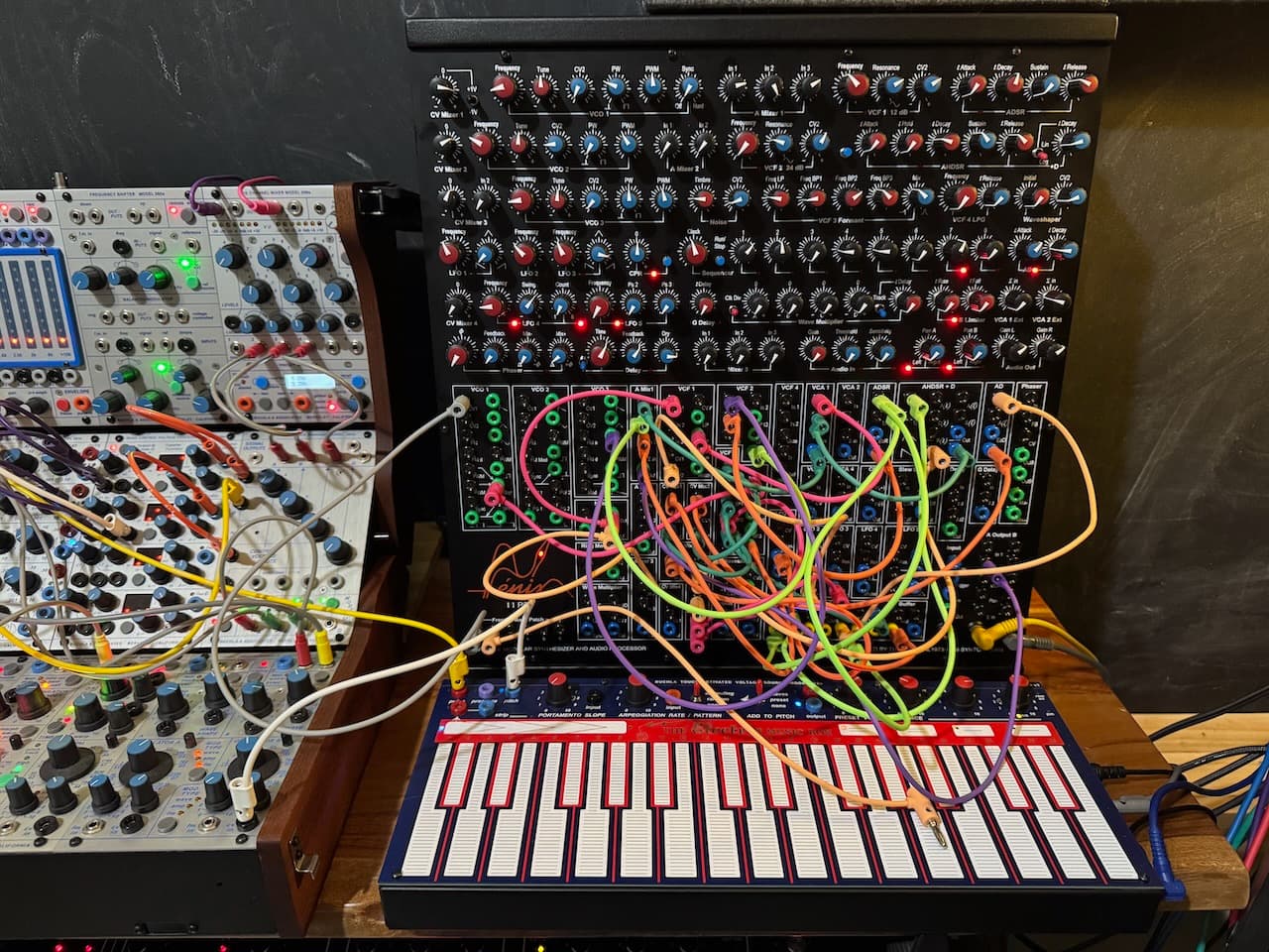 below these is my Prophet 5, which you can’t see. but that’s fine because you also can’t see the new voice card expansion I just bought and installed in it. because I don’t need more polyphony, but I do need the stacking mode that this now enables.