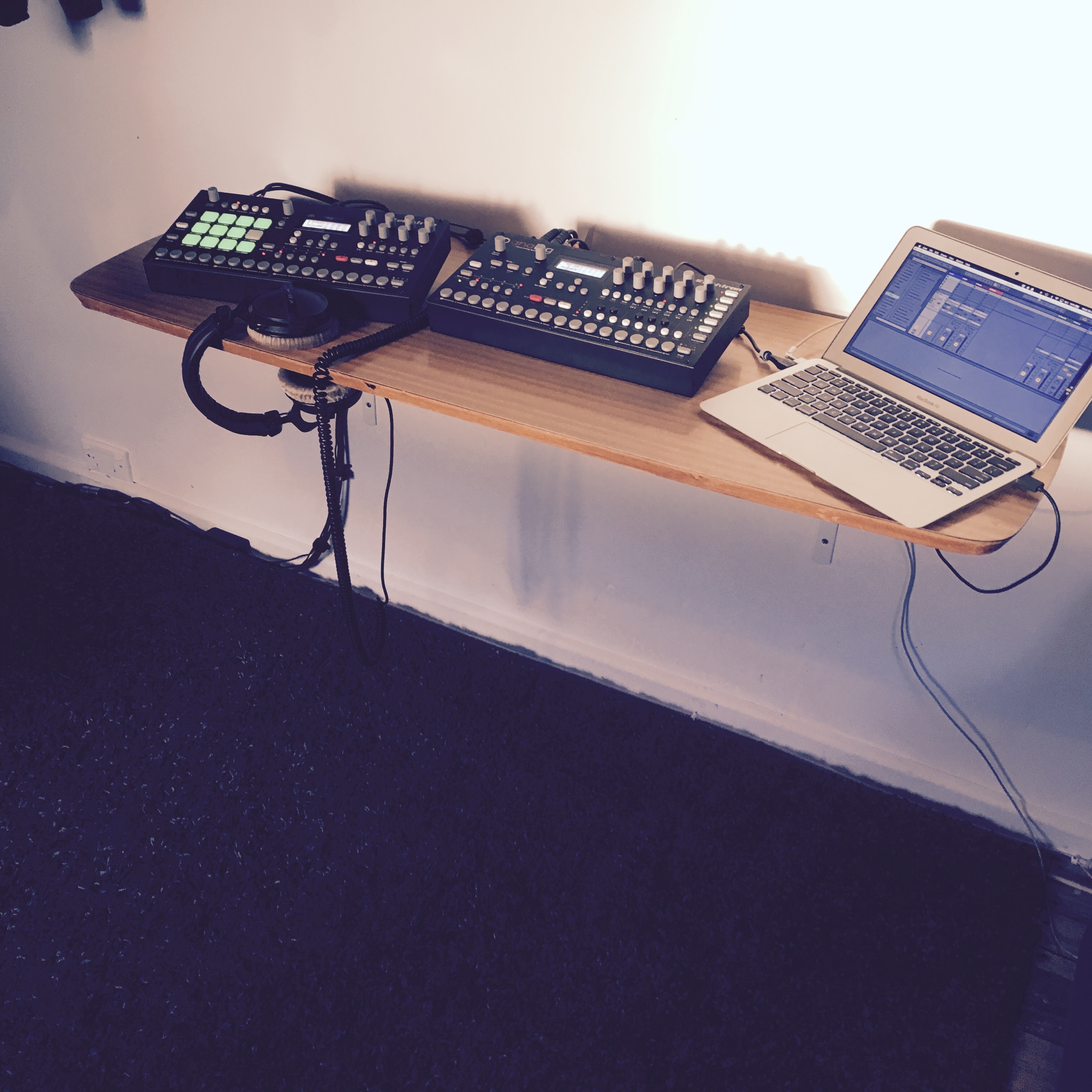 I do this constantly but made some proper changes this week when I sold some stuff off. Was thinking to get a MacBook Pro but who knows maybe a DT. Anyway did a complete renovation on my space, bolted some frames to the wall and setup a floating tabletop. Two Analog boxes, an Air and headphones. This stuff stuff still pipes to some speakers but trying to keep it simple.