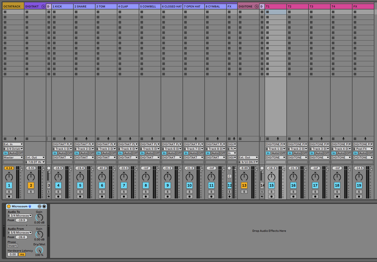 For now I’m using the EXT. Audio Effect to route individual tracks into the Microcosm.