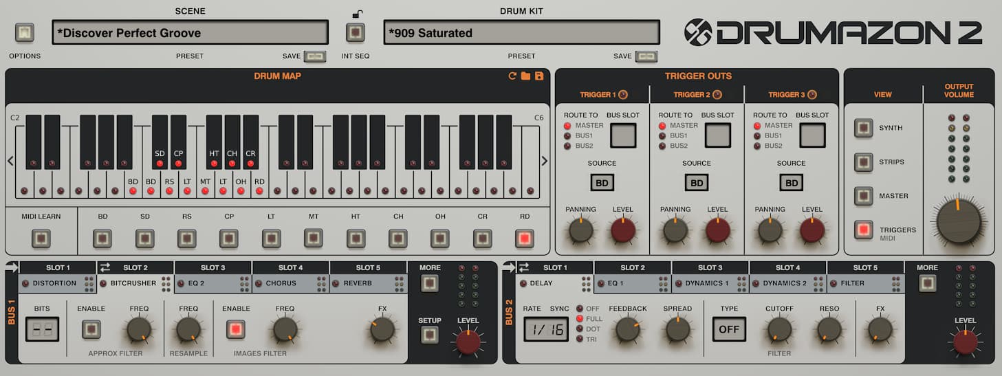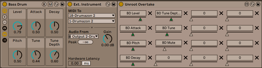 Yeah sure! I’ll be back home on Wednesday so i can share the file if you want to, but in general it comes down to loading drumazon in a drumrack, map the midi note accordingly and then on each pad load an unroot overtake device and map it to the corresponding parameters of that sound. Put the unroot device in a rack with the macro’s et voila.