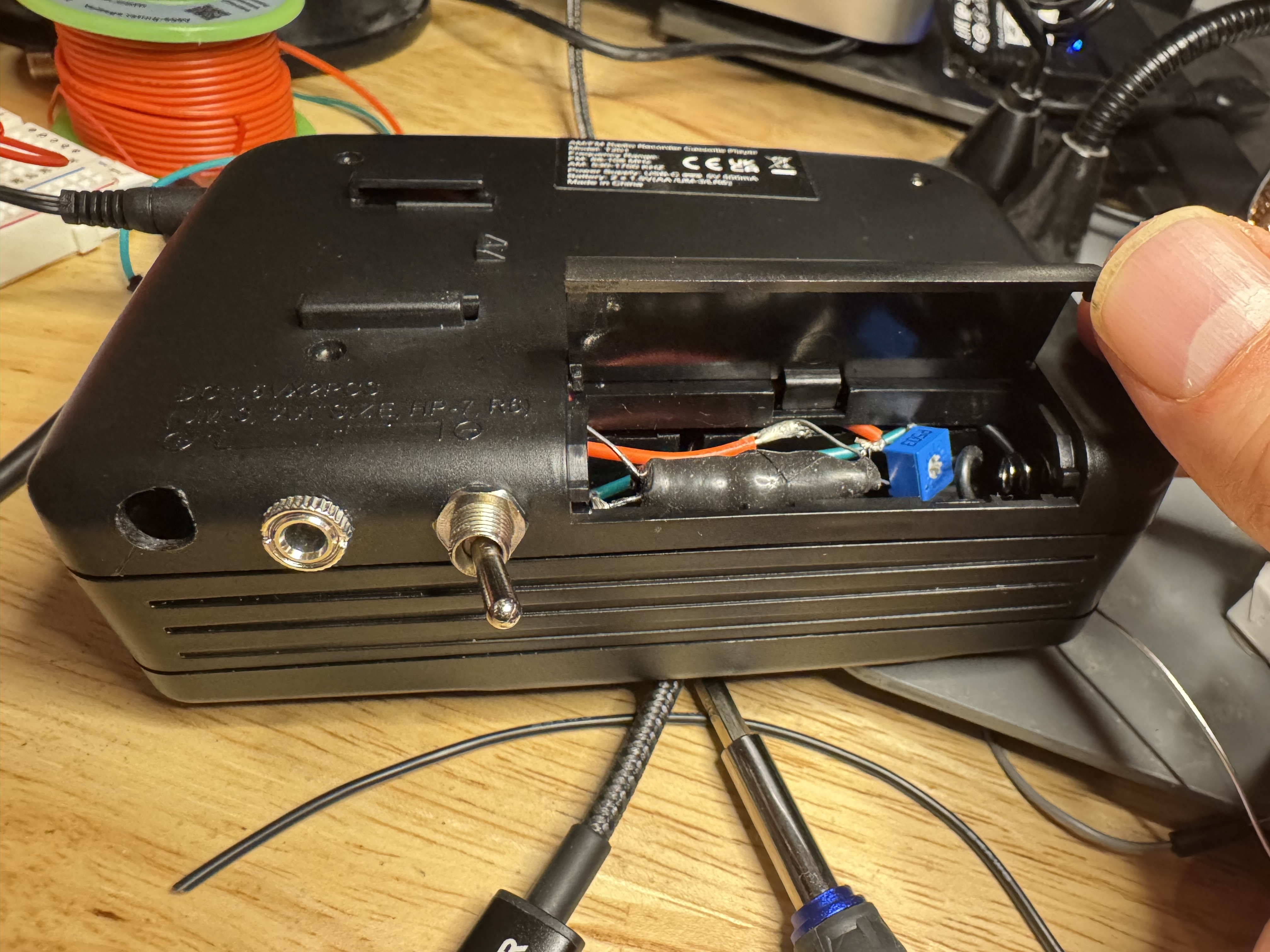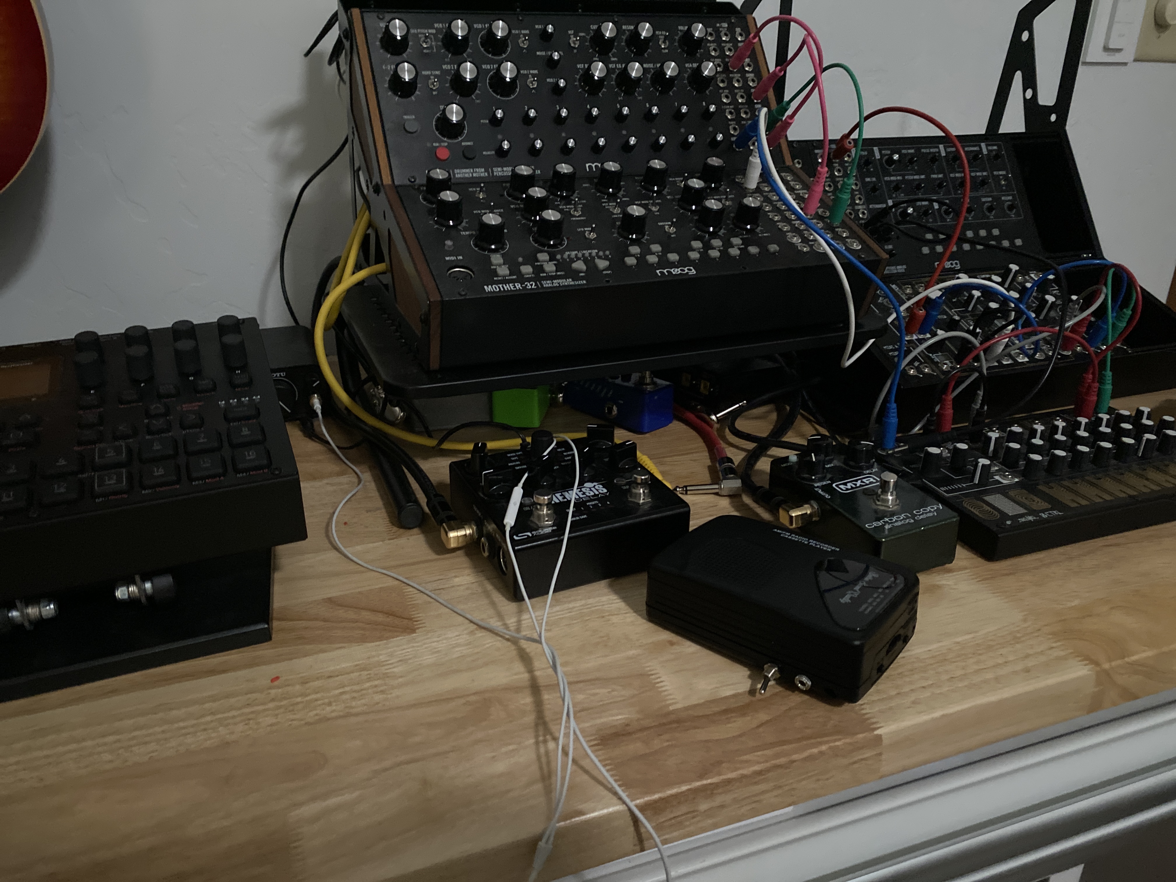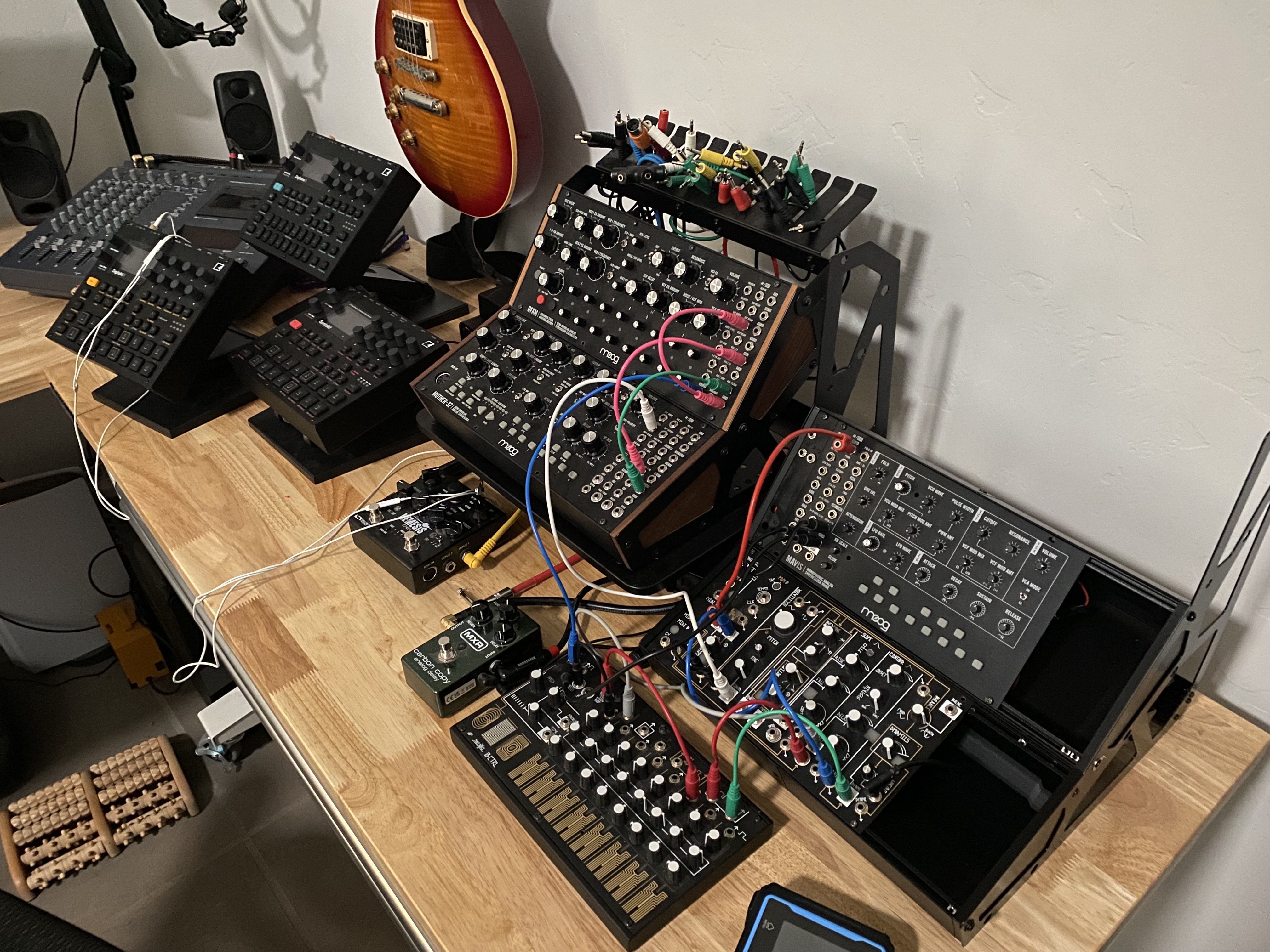 Straightening things up, hooked in the portastudio (and made tape loops and modded a cheap tape player to for voltage control over speed), got a riser and 3-d printed a couple Moog sound studio cases to make way for a spectravox and a few diy modules (inside a 2nd-hand Moog metal frame).