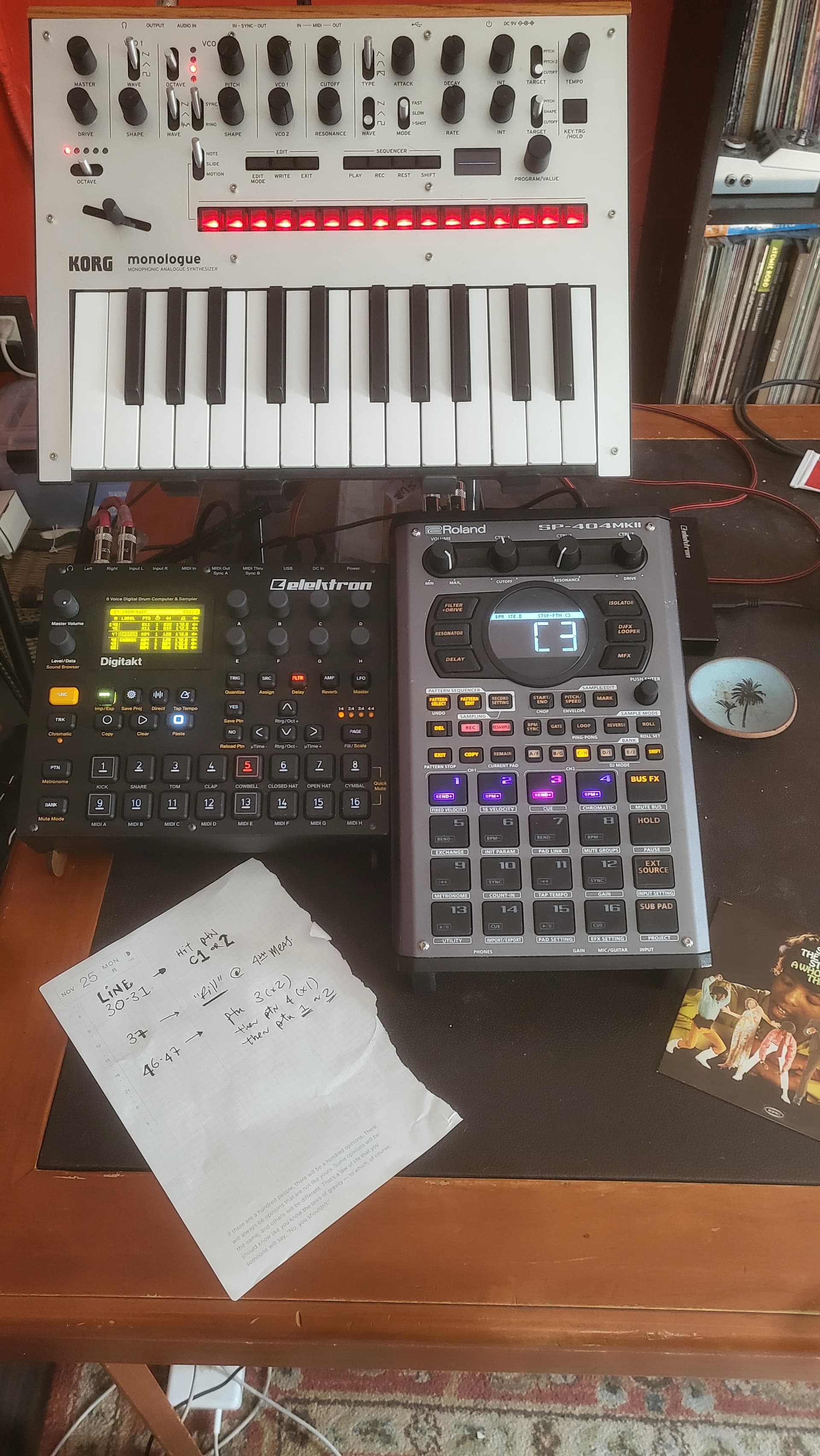My little Midi-to-1/8" adapter is broken, so I’ve gotten really good at hitting Play on the SP and DT at the same time. Also means I have to keep notes to remind myself exactly when to move the SP over to the next pattern. It’s pretty annoying, but it’s also sort of cool to hear them moving in and out of sync with each other as the song progresses.
