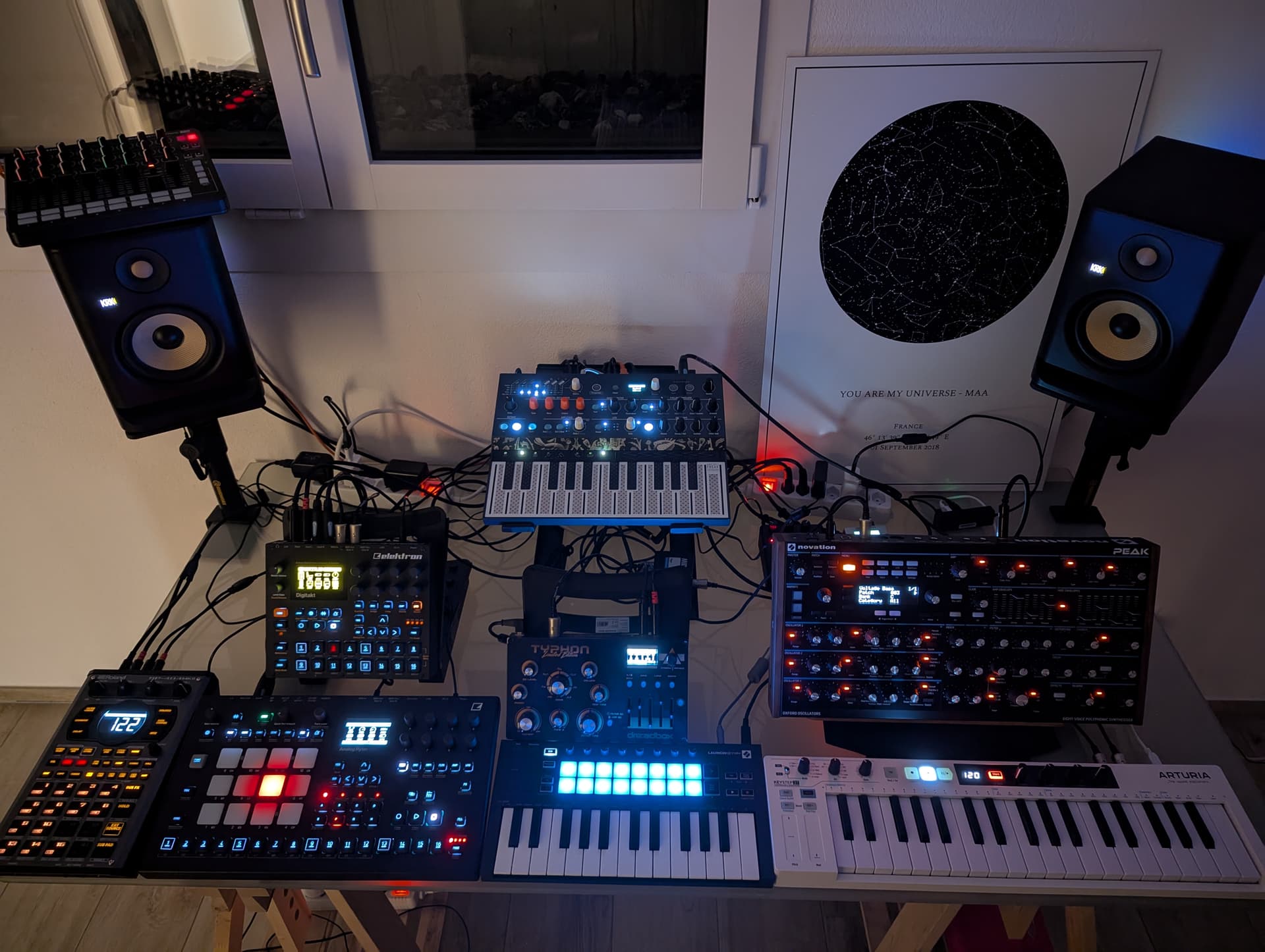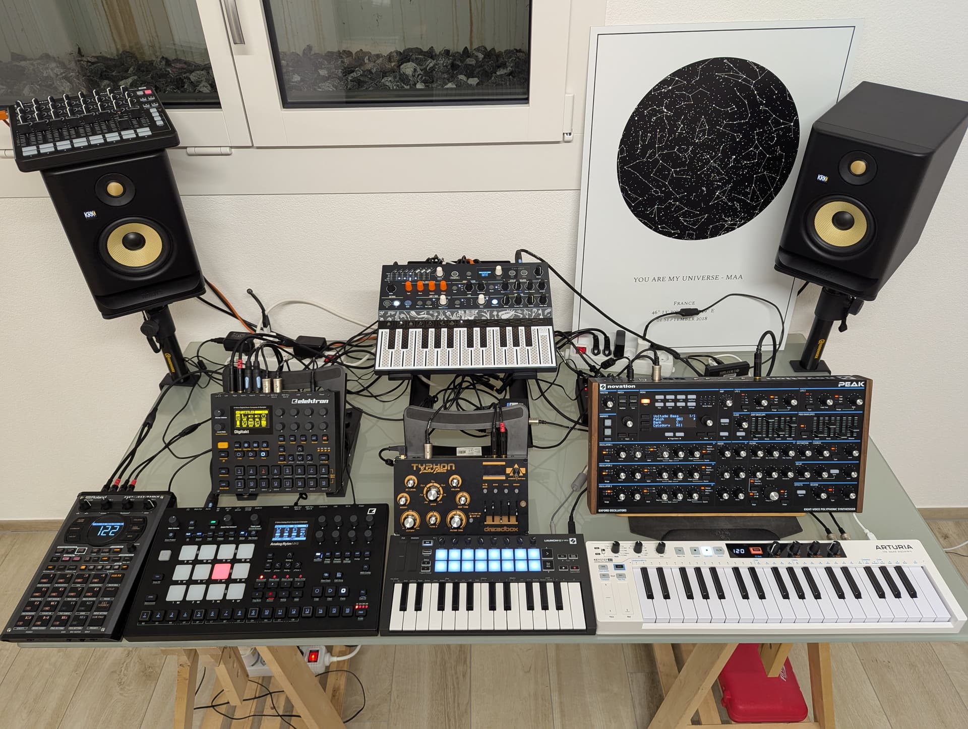 Not visible: Bluebox on mixing duties, controlled by launchcontrol, Zoom MS-50G and Blackhole on Microfreak’s out.